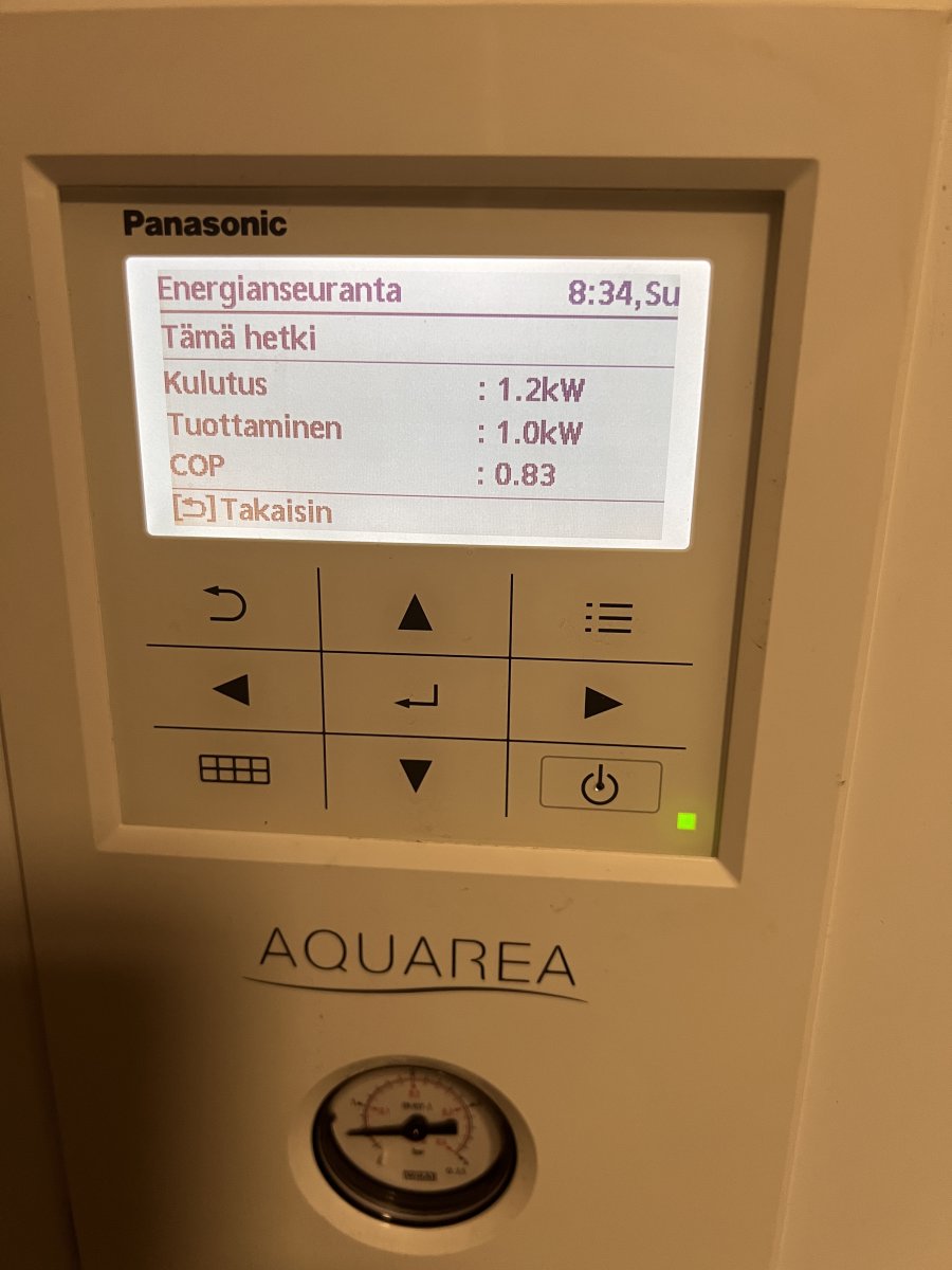 Suljin molemmat kiertovesipumput ja suntit kiinni. Panasonic ei suostu sammumaan vaan tekee varaajaan jatkuvasti 35 asteista vettä. Meno 35, tulo 34. Pyynti on 35. Käy 1.0/1.0 teholla. Normal? :)