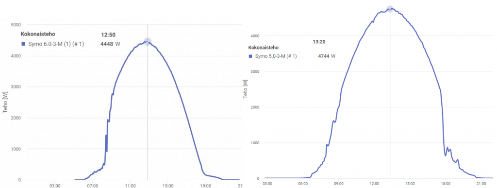 Nyt Froniuksen näytöltä/Appista tuolla 5,36kW systeemillä huipputehot on näyttänyt jopa 5500W. Tosin tuo Froniuksen sivuilla oleva käppyrä ei sinne asti yllä?