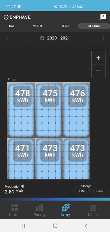 Tukesin ja paikallisen verkkoyhtiön kanssa meni paperihommissa hieman pidempään aikaa, mutta tänään saatu verkkoyhtiöltä tuotantopaikan tunnus ja lupa aloittaa tuotanto sekä näiden myötä myös myyntisopimus tehty lumme-energian kanssa (tunti spot hinta 0€ marginaalilla). Aurinkoisena päivänä tuli järjestelmästä jo 2,4kW tehoja testattua kun kokeiltiin että kaikki toimi, mutta nyt pääsee näkemään sitten miten tuo tuottaa oikeasti. Näin pilvisenä harmaana päivänä maltillisella 200W teholla puskee paneelit sähköä.