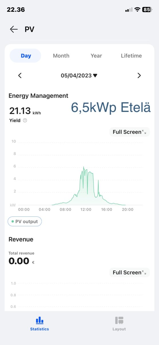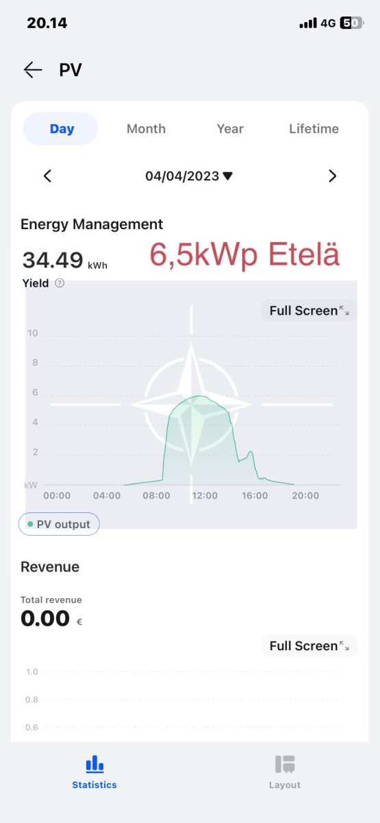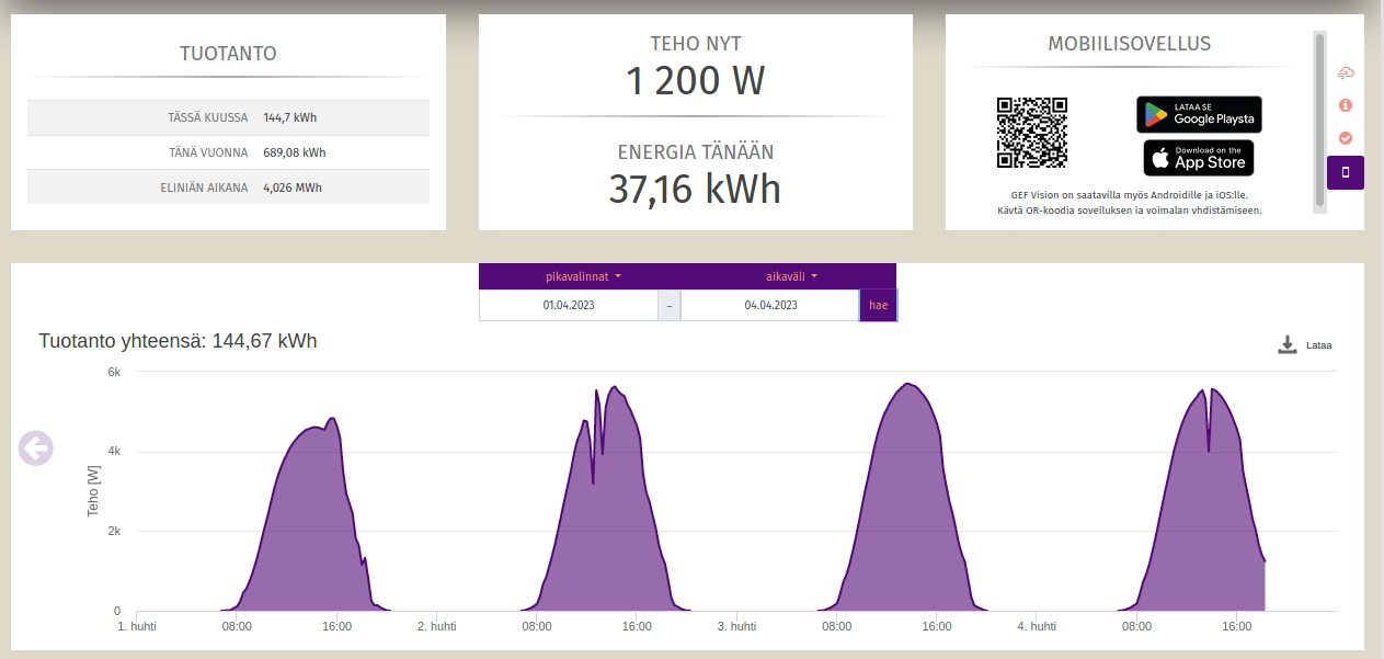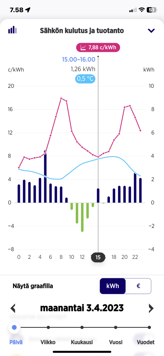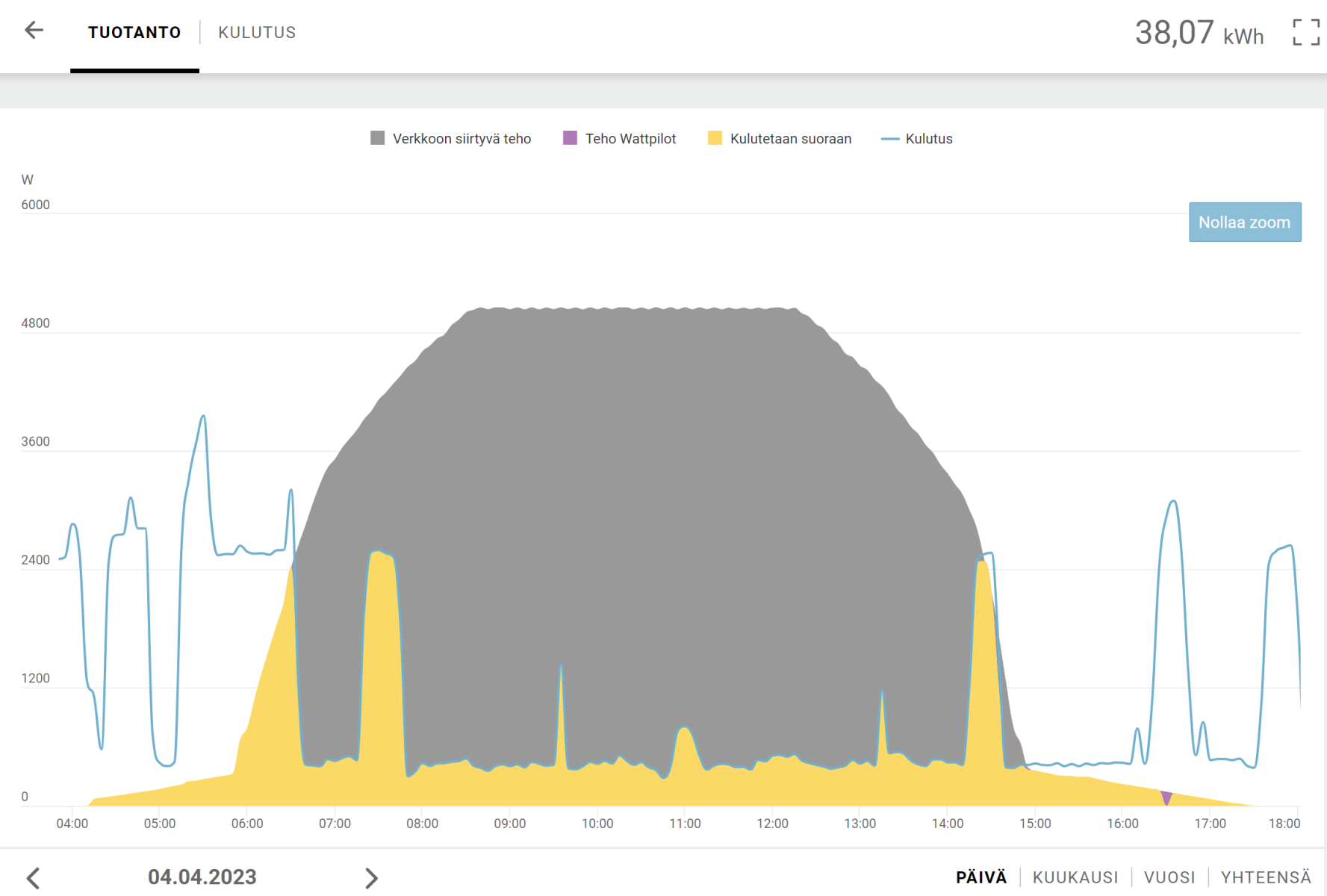 Koivu pitää muuttaa lämpöenergiaksi3.4 näkyy hyvin tuo klo 15 jälkeinen koivun aiheuttama varjostus, kun on kulutusta päällä. Pääsiäisenä tuo on optimoitava.