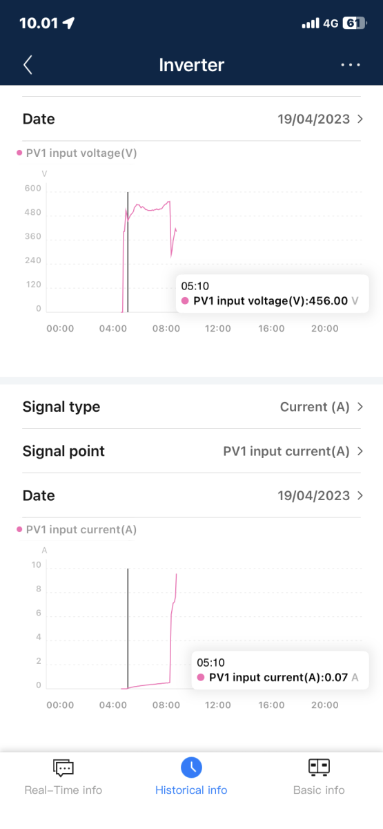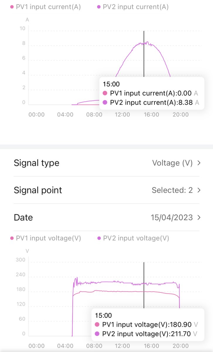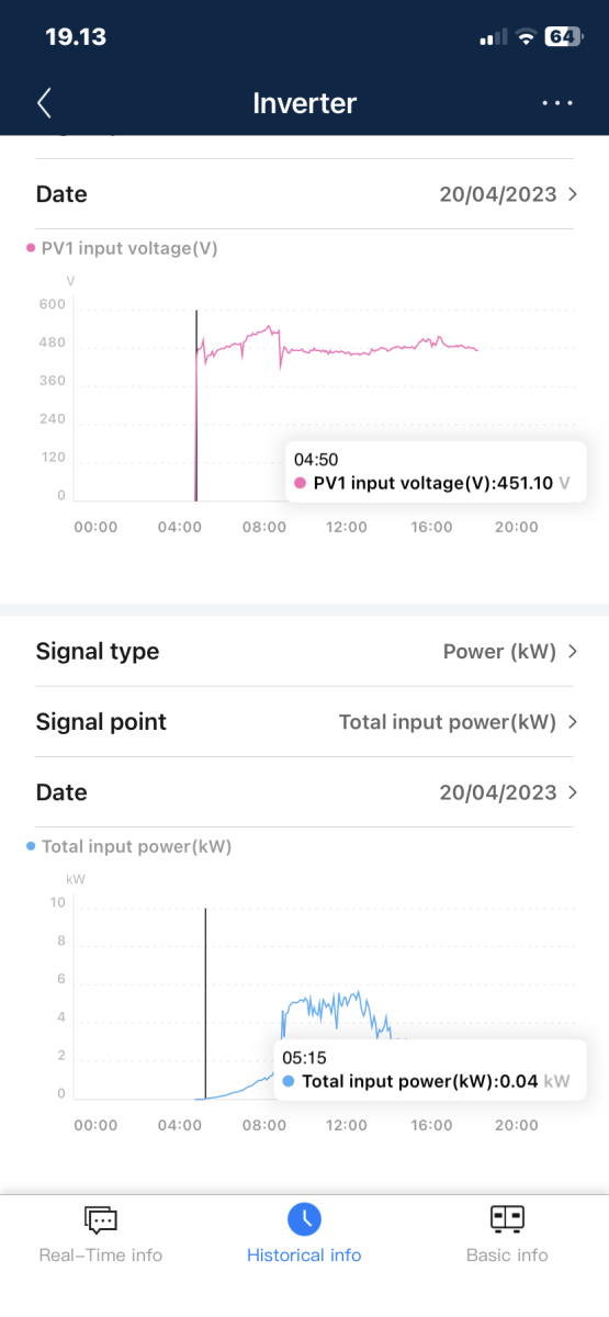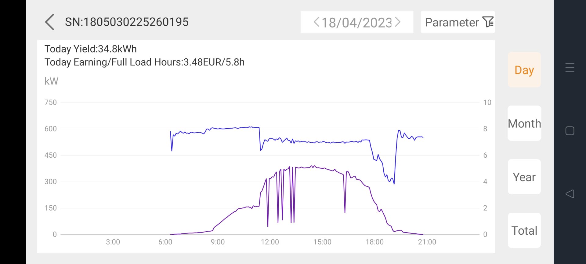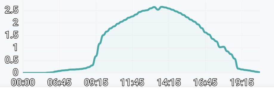 Täällä startti tai lopetus ei ole kiinni jännitteestä vaan aina virrasta. En tiedä mitä sitten tapahtuisi jos paneleita olisi huomattavasti vähemmän. Tässä joku sellainen päivä kun aurinko paistoi lumen läpi.