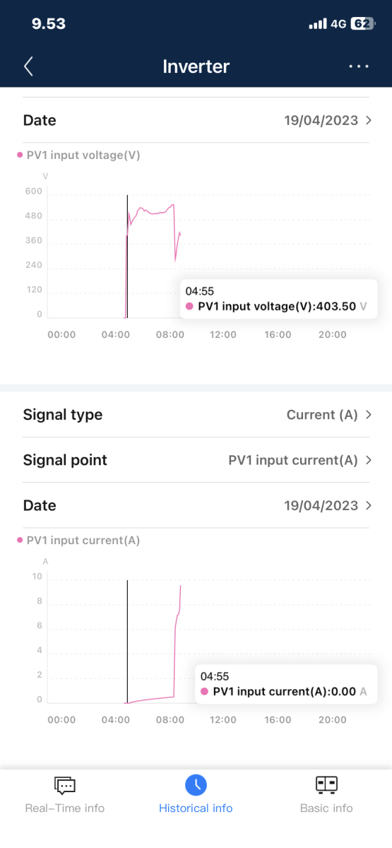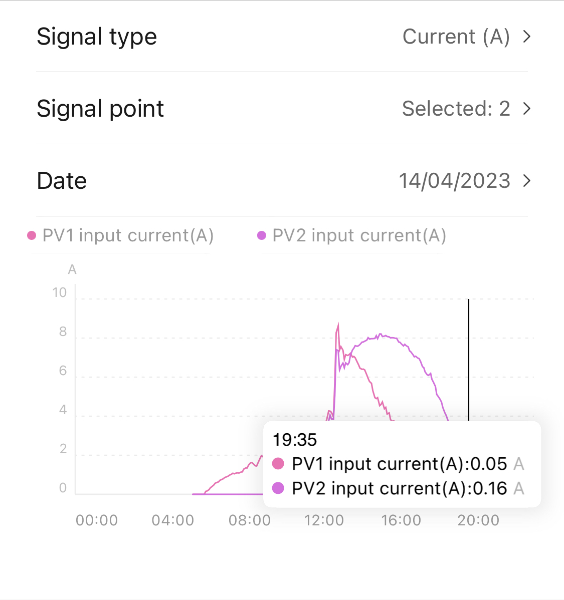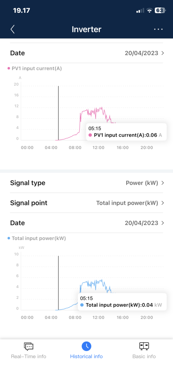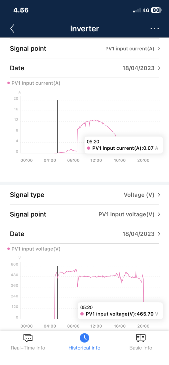 Täällä startti tai lopetus ei ole kiinni jännitteestä vaan aina virrasta. En tiedä mitä sitten tapahtuisi jos paneleita olisi huomattavasti vähemmän. Tässä joku sellainen päivä kun aurinko paistoi lumen läpi.