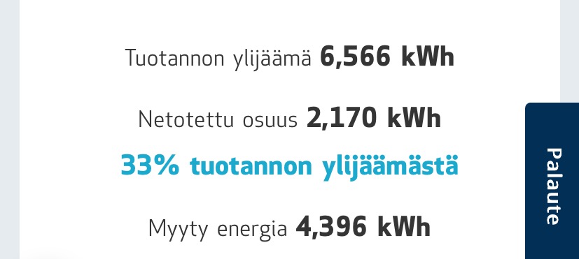 Niin, ja osa tavoittelee että menee just omaan käyttöön, mutta mitään ei osteta verkosta. Voihan sitä vaikka saunoa pitkän kaavan mukaan joka paistepäivänä, niin saa omakäyttöä ylös, tai laittaa muuta kuormaa. Valhe, emävalhe, tilasto.