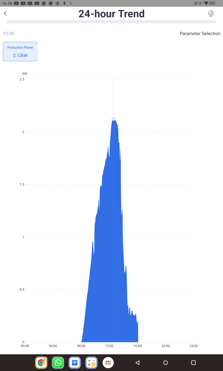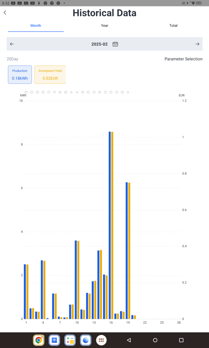 Vuosi -23 124 kWh64 kWh täällä, 15,2 kWh/kWp. Turun suunnalla tainnut päivä paistaa paremmin. Tehohuippu ollut 2,1 kW ja kevyellä pilvelläkin tullut 700 wattia , kuitenkin helmikuu! Paras päivä oli 16.2. 8,6 kWh.