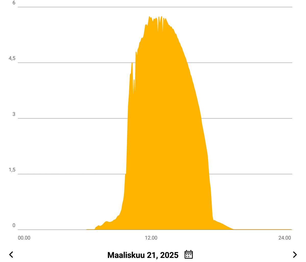 Koittanut katsella teidän noita tuotantokäppyröitä, että milloin 1kW raja aamulla ylittyy suurinpiirtein saman kokoisista järjestelmistä, kun idän puolella on omassa pihassa muutamia puita niin niiden haittaa kartoittanut, että onko niitä tarvetta lähteä poistamaan. Aamulla aurinko kuitenkin aika matalalla. Omassa järjestelmässä esim eilen klo 8.45 teho oli 0,48kW ja klo 8.50 1,5kW. Lähinnä kiinnostaa tuo aamun tuotanto tuohon klo 8.45 asti. Tuon jälkeen omat paneelit tulee kokonaisuudessaan auringon valoon ja tehot lähtee hyvään nousuun. Kuinka monta kWh tuosta aamusta auringon noususta - klo 8.45 vois saada ihan esteettömällä voimalalla?