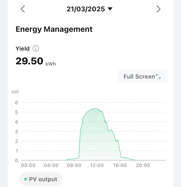 Hyvä päivätuotto oli eilen. 8.3kwp etelän suuntaan n. 26asteen kattokulma. Vielä ei 6kw invertteri leikkaa huipputehoja. 34.4kwh päivätuotto. 62% tuotosta saatu ohjattu omaan käyttöön.