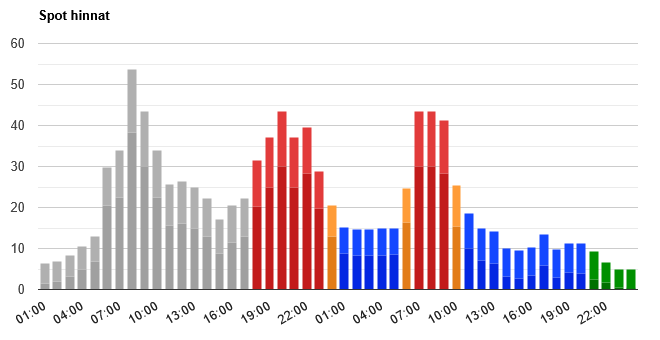 Tumma palkki on myynti- ja vaalea ostohinta. Näen heti että juuri nyt auton lataaminen auringolla olisi tyhmää, koska 7 tunnin kuluttua se maksaa vähemmän ja 30 tunnin kuluttua paljon vähemmän. Samasta syystä latasin varaajaa viime yönä ostosähköllä enkä aurinkosähköllä tänään aamupäivällä.