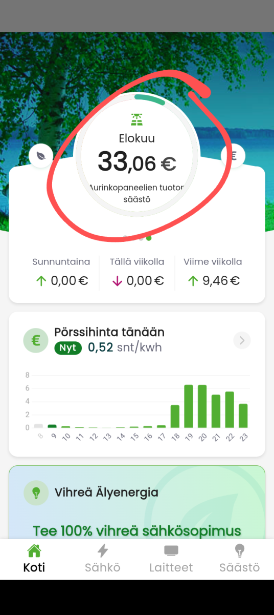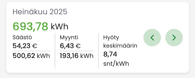 Tarkoitettiin varmaankin kokonaishyötyä, ei pelkästään myyntiä. Minä seruraan vain kokonaiskustannuksia. Näyttäisi olevan n. 48EUR per 6kk poislukien siirron maksut. Tosta kun laskee kk-hinnan pois niin ei jää energialle kuin reilu kymppi. Halpaa on, Pitäis siirrot vielä laittaa tietokantaan mutta niiden aiheuttaman kustannusten kimppuun pääseminen on vaikeaa.100€ myyntiä? Kova suoritus näillä hinnoilla.