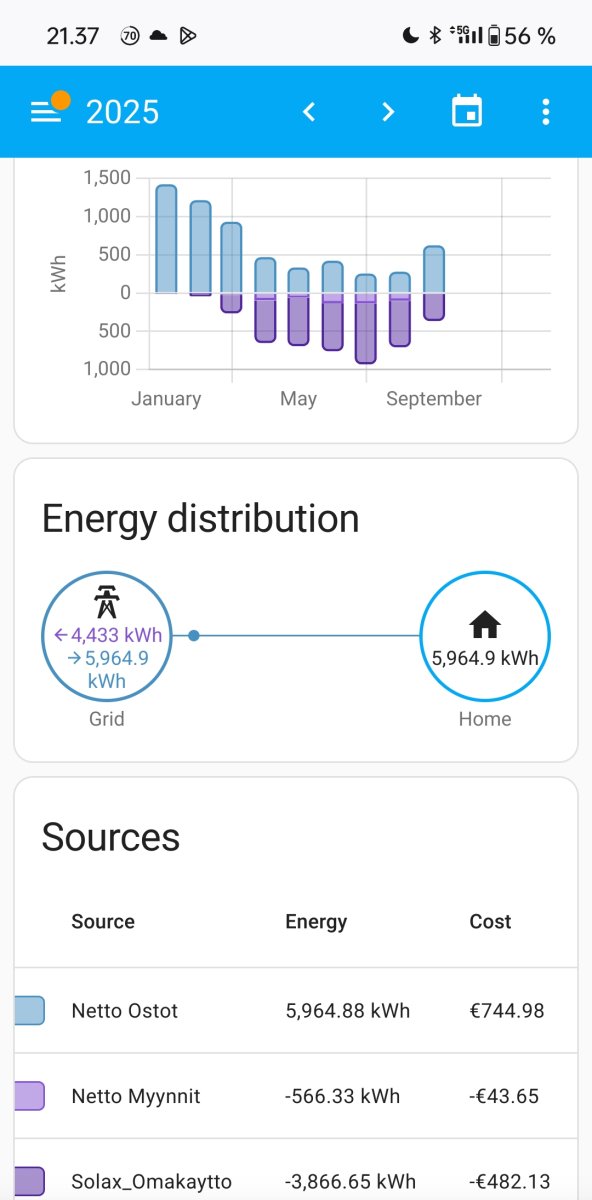 Mulla nyt 4260 kWh, jäytää mieltä kun vitkuttelin ja pääsin tuotantoon vasta huhtikuun lopussa.405,2 kwh näyttää nyt syyskuu, huomenna saattaa mennä vuoden osalta 4400 rikki. Mutta kuten aiemmin ennustin, niin 5k ei kyllä rikki mee tänä vuonna, juuri yllämainitsemistasi syistä.