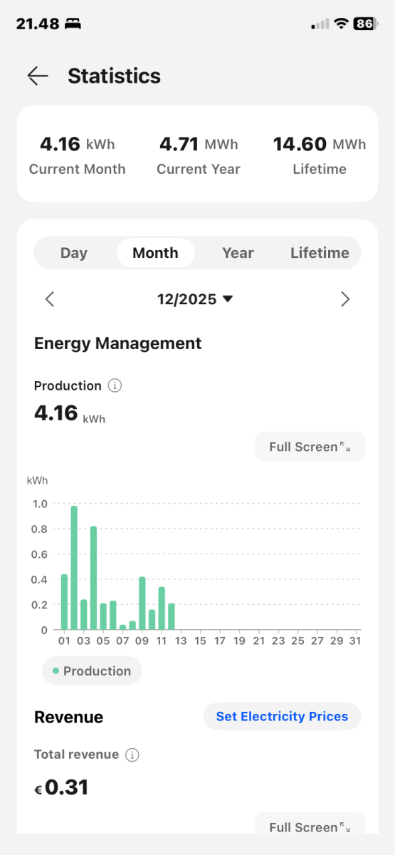 Erikoista että ei ole tullut mitään. Vai onko kyse loivemmasta kulmasta ja huonosta säkästä. Kotivoimala antanut pilvisellä säälläkin pientä tuottoa. Kuvasta puuttuu tämän päivän tuotto.Tänään aurinko näyttäytyi pitkästä aikaa. Tuli tarkastettua että tuleeko paneleista mitään. Ei tullut, -6 astetta piti siitä huolen ja ilmeisesti jäätä oli sen verran panelien päällä että auringon lämpö ei sulattanut niitä.