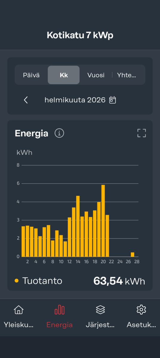 Ja lisää on luvassa lumimyräkän jälkeen. Pekka povaili jo kevään alkamista. Kuivaa ja aurinkoista luvassa. Mutta myräkkä ensin.Mukavasti heräsi mökin voimala jo 7.40. Aurinko viimeisteli lumen putsauksen. Aamukaffet lämpiääki sitten keltaisella energialla. 300W teho nyt. Hyvä päivä tulossa. Kotona tulee näillä ennusteita lähemmäs 30 kWh, katsotaan mitä täältä mökiltä saadaan kasaan.