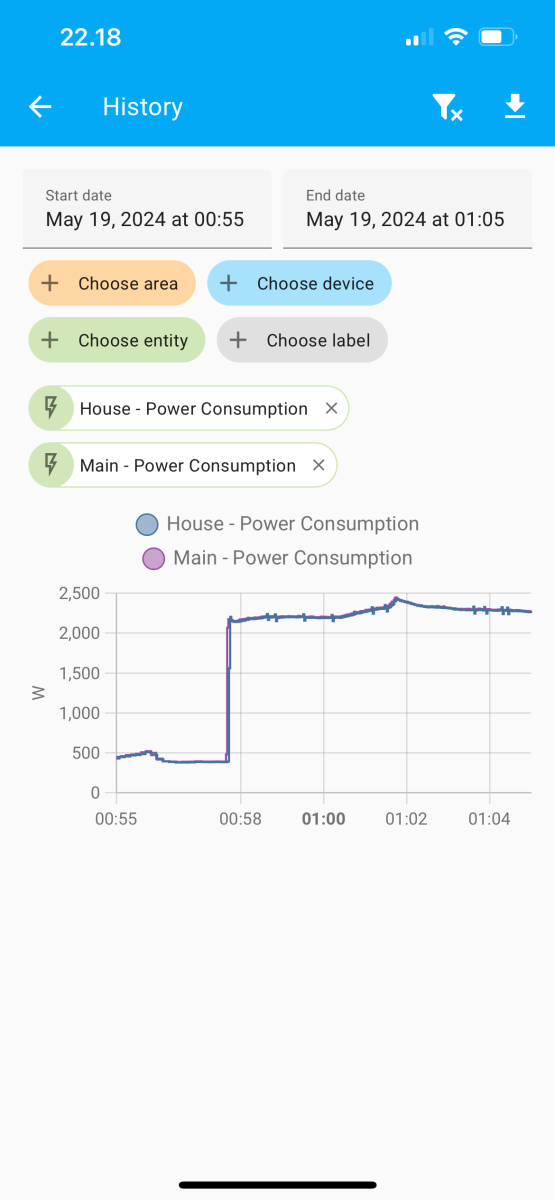 Miksi muuten kaipaisit tarkempaa resoluutiota? Itsellä riittää tuo minuutin tarkkuudella tuleva lopullinen tieto. Se on varsin hyvin jo keskiarvoistettu, koska se on se määrä, mikä sähköyhtiöllle lähtee. Pari päivää mennyt aika hyvin tältä osin. Jokaisen tasevartin alussa arvioidaan keskimääräinen kulutus ja sen mukaan päätetään kauanko kattilaa lämmitetään että menee vartin nettotuotto nollaan.