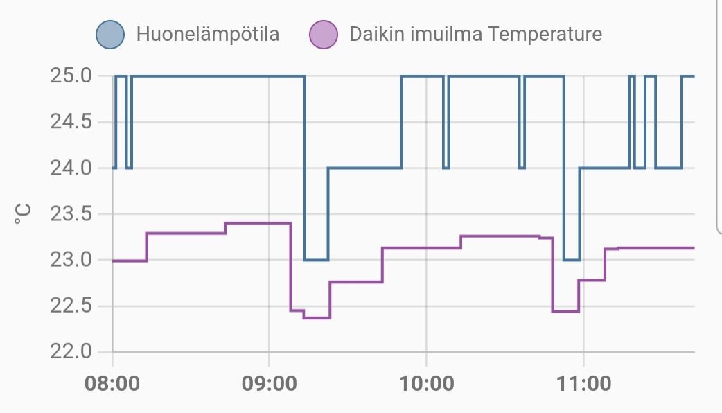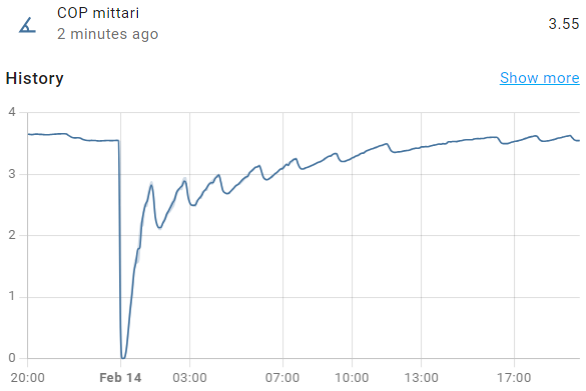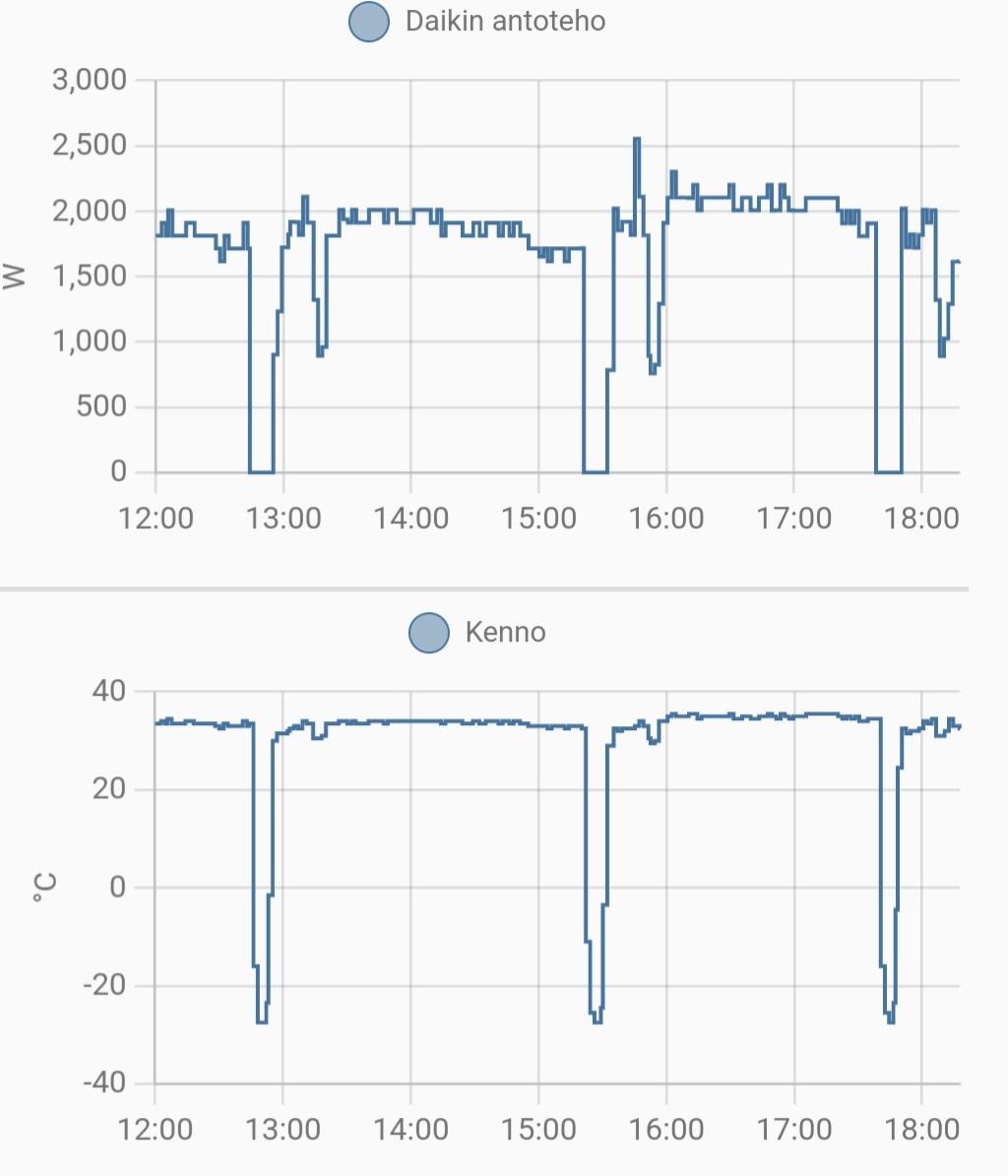 Hyvännäköistä, pystytkö jakamaan miten teit tuon?Vihdoin sain tuon toimimaan käyttäen average -sensoria. Tänään ollut Daikinissa erikoinen ilmiö. Vähän sulatuksen jälkeen kennon lämpötila ja ja näin ollen antoteho laskee hetkellisesti, ottoteho pysyy kuitenkin tasaisena. Mistäköhän tuommoinen voisi johtua?