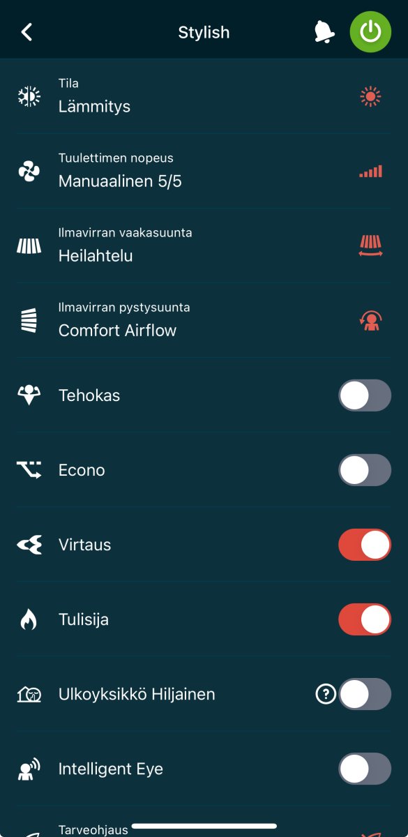 Tänne saapui myös Stylish N30 ja on kyllä harmillisen rampa tuo Onecta integraatio. Ei voi kytkeä eco modea, ei tarveohjausta, ei streameria, ei fireplacea, ei hiljaista ulkoyksikköä, viisasta silmää, ei ei ei ei ja ei.