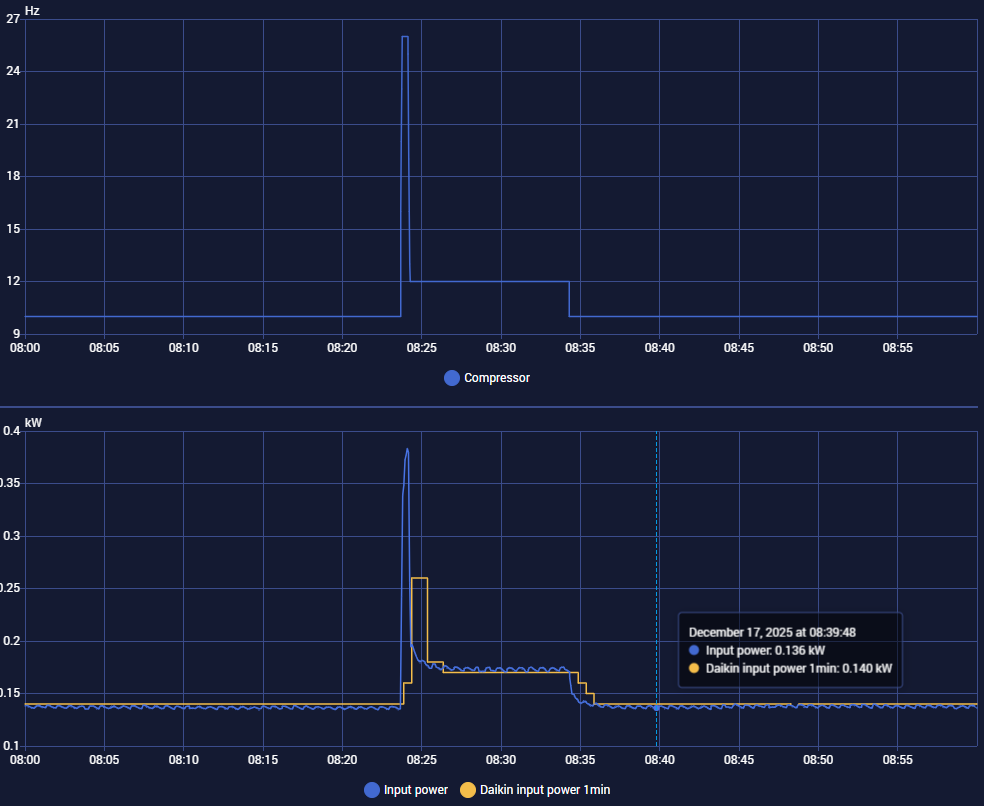 Lähes satavarmasti Daikin ei taivu noin alhaisiin ottotehoihin, ja se, mistä sain edes päähäni esittää tuota aiempaa teoriaa johtui siitä, että itsellä Tuya-pohjainen laite ilmoitti nuo arvot ristiin, ja juurikin tuollaisia ottotehoja, kuin sinulla. Totuus oli, että se ilmoitti milliampeeritunnit virrankulutuksena. Kun tuon korjasin, tippui tuon pythonisi antama COP-arvo n. 7,6:sta noin 3,8:aan, joka on realistinen arvo.