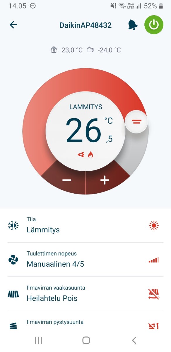 Täytyy kyllä sanoo, öhöm, että tämä pumppu on lämpötilansäädöltään todella SURKEA. Nyt kun lämpeni taas nollan pintaan, sisällä on yli 25 astetta lämmintä. Ja pumppu vain pukkaa sitä yli 30 asteista ilmaa. Eli se ei nähtävästi koskaan lopeta lämmitystä. Ja tässä pitää huomata, että pyyntiä on jo LASKETTU. Eli ulkolämpötilan mukaan joutuu aina säätämään. Ei voi kuin nauraa tuommoiselle säädölle. Minkälainen lusmu saa suunniteltua tuollaisen systeemin joka ylilämmittää, vaikka huonelämpötila nousee selvästi yli pyynnin? 😭