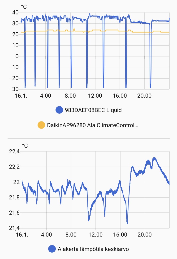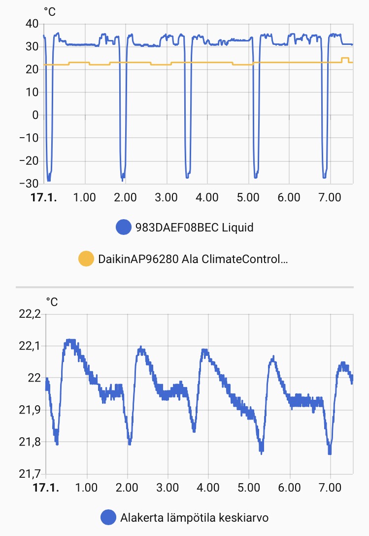 @Kaimo Ärräpää Alakerrassa lämmitetty kakluuni päivällä ja Perfera hoitaa muuten lämmitystä. Kuvan ylägraafissa pumpun puhallus (liquid) ja pumpun mittaama sisälämpötila. Alemmassa graafissa kauempaa huoneistosta mitattu kahden RuuvinTagin mittaaman lämpötilan keskiarvo. Ylilämmitykseen on automaatio, mutta ei ole aktivoitunut. Ulkona eilen nollaa ja nyt -2. Kyllä tuo yli 30 asteista pukkaa man 4/5 puhalluksella, mutta ylilämmölle ei mennä.