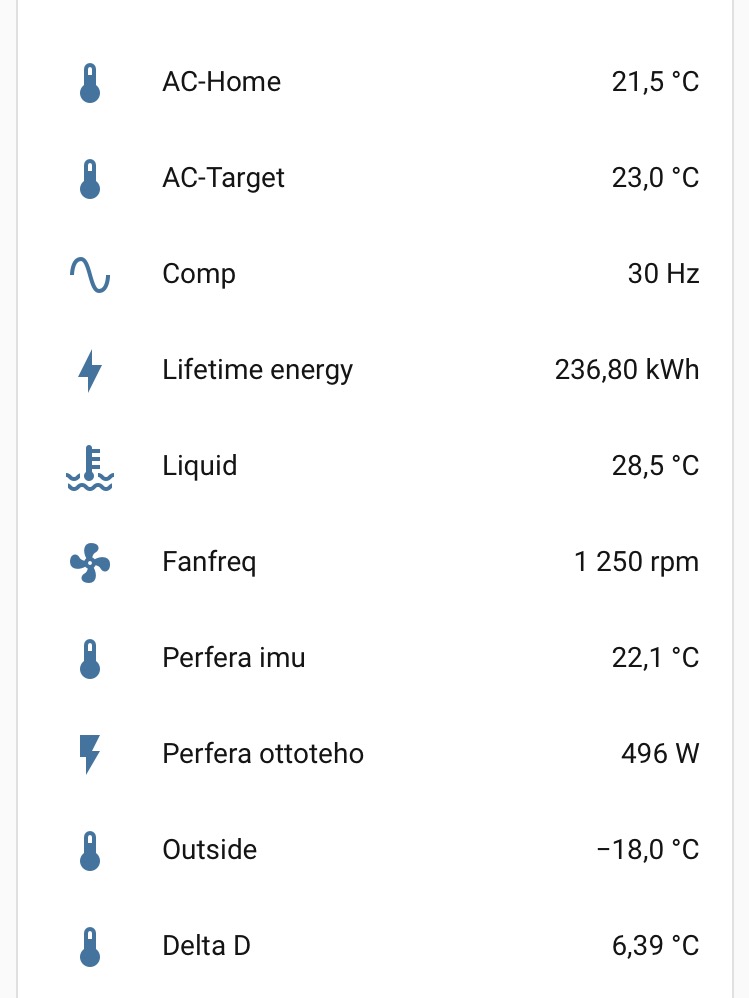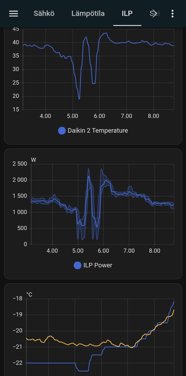 Eilen nostin pyynnin 30-asteeseen, mutta pumpun puhalluslämpötila tai käytös ei muuttunut mihinkään. Eikös terveen pumpun pitäisi rynnätä täysille, kun lämpötila on huomattavasti alle pyynnin. (Sitten mahdollisesti ylilämmittää ja alkaa katkoilemaan a'la Daikin style). Teoria, että lämmin ilma jää pyörimään ILPin lähelle ei mielestäni tässä päde, koska ei saavuta lähellekään pyydettyä lämpötilaa. Ihan kuin ILP olisi jossain failsafe moodissa tai muuten vaan ei ymmärrä mitä siltä halutaan. Lämpötila on pudonnut eilisen 30 pyynnin noston jälkeen 12-asteeseen. Tukena pari sähköpatteria ja märkätiloissa lattialämpö pienellä.