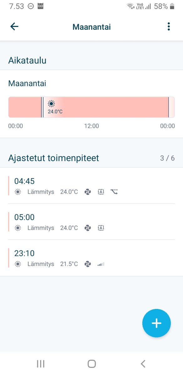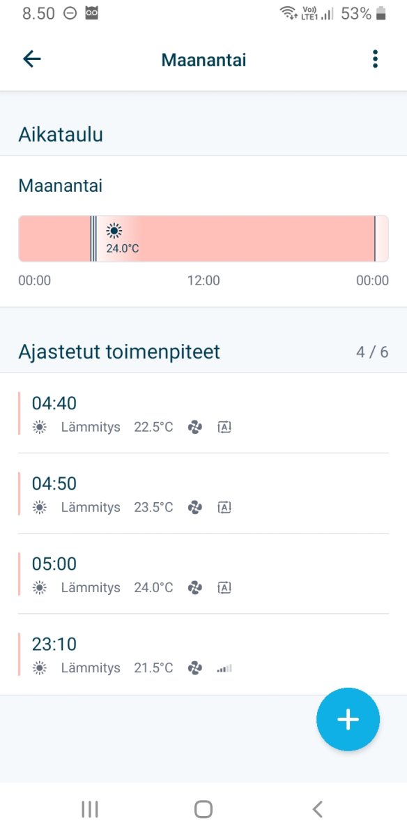 Tuossa voi tallentaa kolme erilaista ajastusohjelmaa. Mutta mielestäni tuo Onecta (Daikinin käynnykkäappi) on noihin aika vaikeakäyttöinen. Ajastusohjelman valitsemiseksi pitää ensin avata Onecta, jossa kestää kauan. Sitten, jos appi toimii, Aikataulu --> Viikkoaikataulut --> Daikinxxxx --> vasta tässä näkyvät aiemmin ohjelmoimasi aikataulut eikä niiden nimiä voi vaihtaa. En voi suositella. Mieluummin heti se HA (kai). Ei ole siitä kokemusta, mutta täältä lukemani perusteella näyttää paljon selkeämmältä eikä tarvitse käyttää hidastelevaa Onectaa. :grandpa2: