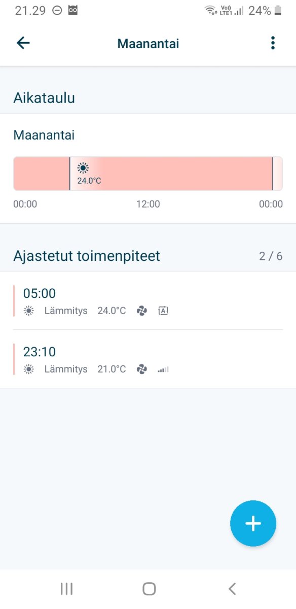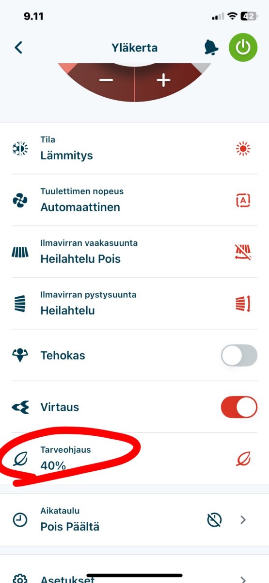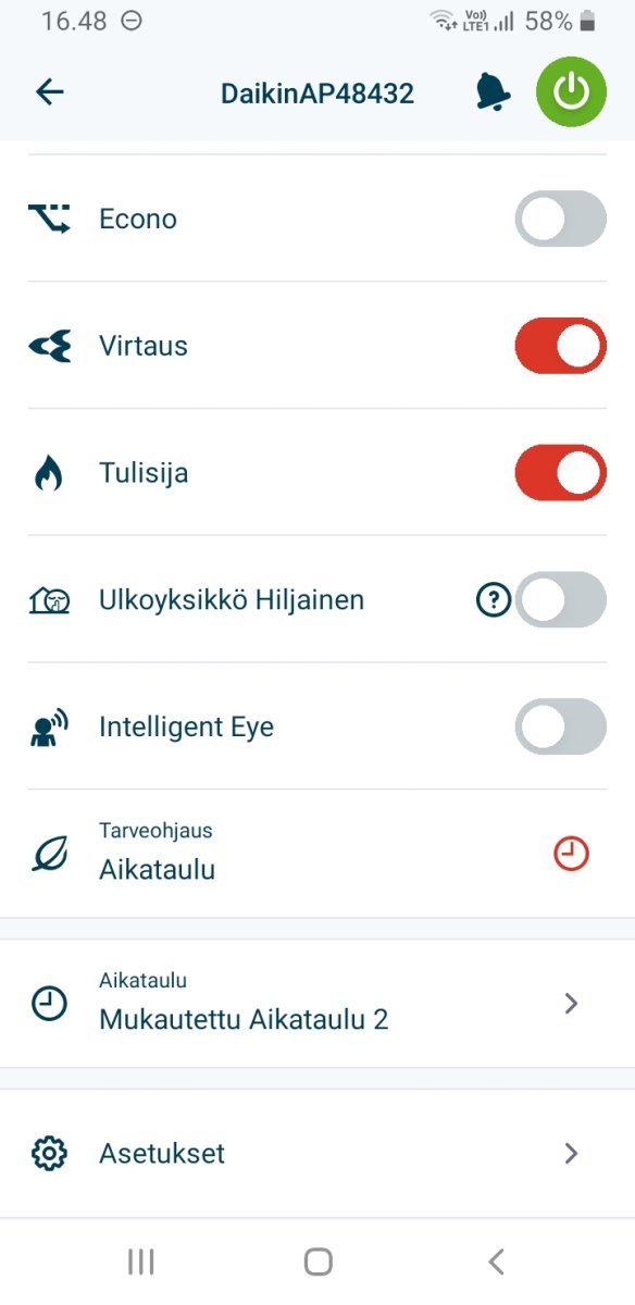 Oli miten oli, nyt on ollut ihan muutamaa astetta vain pakkasta eikä kyllä kuumalta sisällä ole tuntunut vaikka huonemittari on näyttänyt nyt yli asteen enemmän. Käytännössä ihmisen korkeudella kai lämpötila on vaihdellut huomattavasti vähemmän , mitä mittari antaa ymmärtää . Eli kovemmalla pakkasella sisällä ollut n. 24 ja nyt 25 pinnassa. Aamulla on ollut kylmää 20-21 kovemman pakkasyön jälkeen. Pitäisi olla automaatio , että kovemmalle pakkaselle ei pudota yöksi kuin vain esim. 1 aste pyynnistä vakio 3:n sijaan . Eli tuossa alla Onectan lämpötila ym. asetukset, joka päivälle sama . Noihin ei ole nyt yli kuukauteen juuri koskettu. Lisäksi on vielä tarveohjauksen ajastus joka aamu 95 %:n 20 minuuttia lämpötilan noston yhteydessä. En tiedä onko siitä ollut mitään hyötyä . Näkeekö mistään ilman Faikoutia, mikä tarveohjaus-% parhaillaan on käytössä?