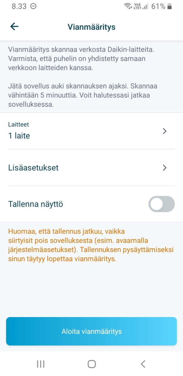 • Tarkista Wi-Fi/Verkko: Vaikka Wi-Fi näyttäisi täysiä palkkeja, yhteys Daikinin palvelimeen voi olla hidas. Kokeile vaihtaa mobiilidataan, jotta näet, johtuuko hitaus kotiverkosta.