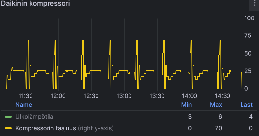 Huono homma, mutta ehkä tokenee.Tarveohjaus lakkasi toimimasta P40 H? N. Klo 10.30 käytin pumpun virrattomana. Tämän jälkeen ei ole enää tarveohjaus toiminut, vaan pumppu ryntäilee ja menee katkolle. Ennen tuota sammutusta tarveohjaus toimi normaalisti, niinkuin kuvaajasta näkee: