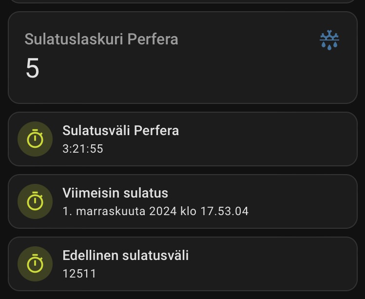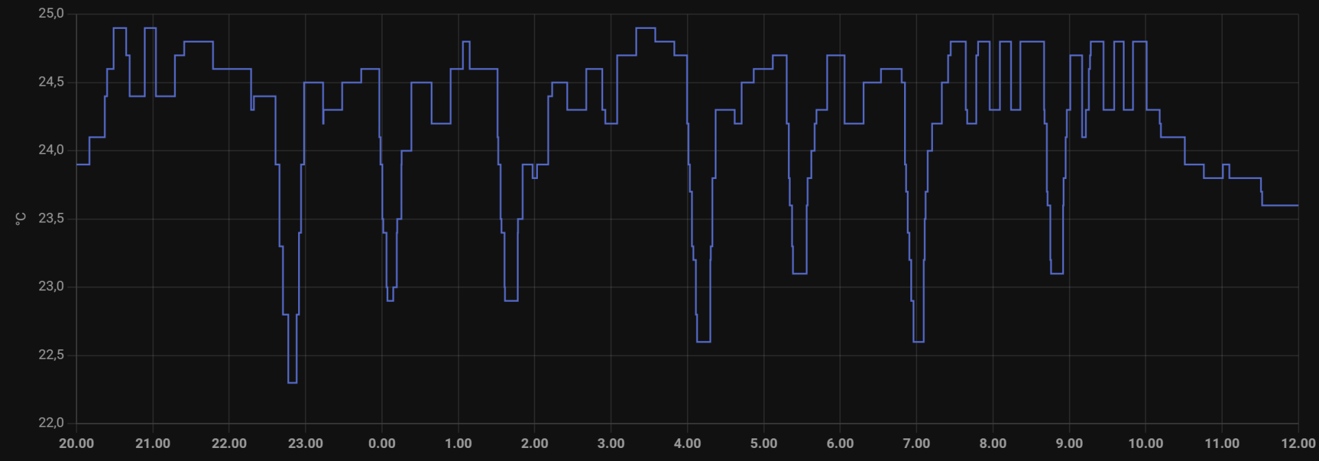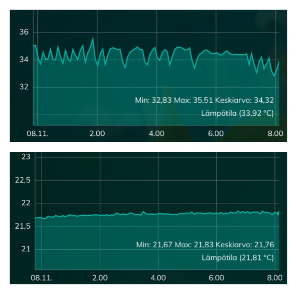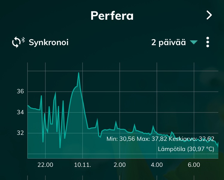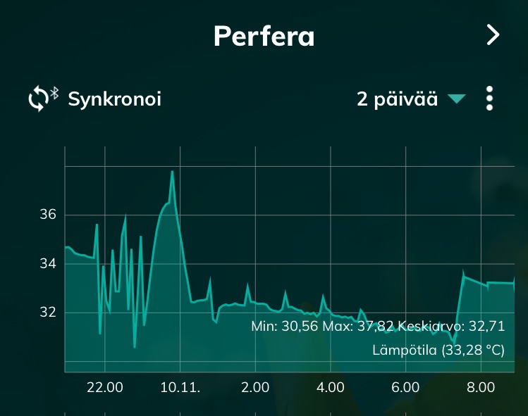 katkokäyntiäkin voi olla. Riippuen anturiesi sijainnista ja herkkyydestä. Sulatuksessa herkällä anturilla puhallusaukosta mitattuna putoaa paljon alemmaksi lämpötila. ~22 astetta on kaiketi normaali huonelämpötilaKesällä asennettiin Perfera N30 ja tässä on nyt Varsinais-Suomessa saatu ensimmäisiä nollakelejä. Onko näillä keleillä normaalia se kun lämpötila seilaa nollassa että sulattelee n. 1,5h välein? Pyyntönä on 21, ei tarveohjausta ja puhallus man 5/5. Ohessa dataa lämpömittarilta joka on ILP päällä. Itse en ollut kotona mutta minun kokemattomaan silmään nuo ainakin vaikuttavat sulatuksilta.