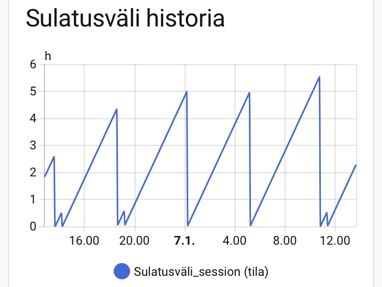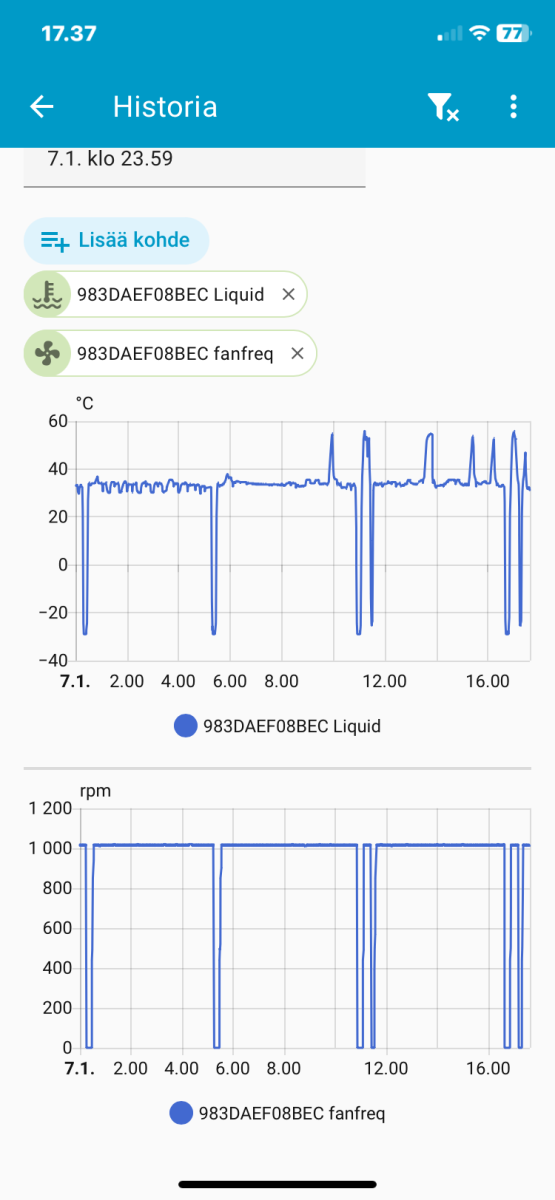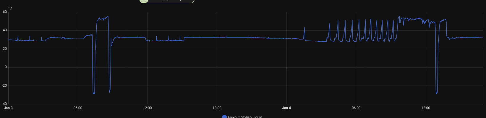 Ainakin sain selville sen, että kun tuo viimeksi tapahtui klo 11.05, niin samaan aikaan oli nesteen lämpötila pudonnut alle 30C:n.Tämä voi olla syy. Miten tuota voisi logittaa ?