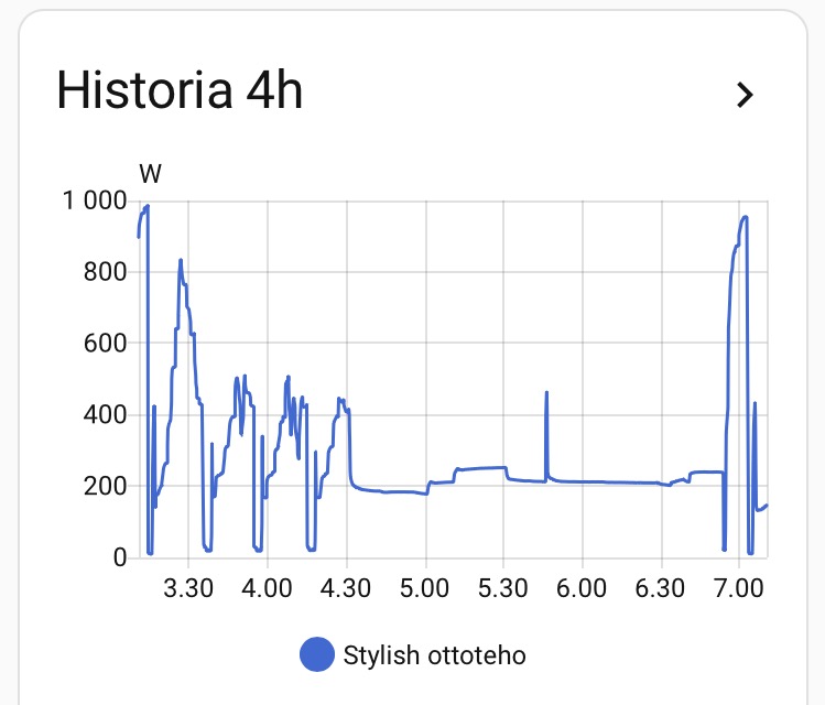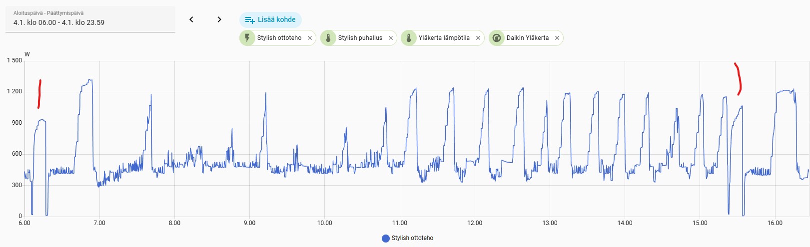 Juu pienillä tehoilla on menty. Sinänsä kuitenkin kiva, ettei tule mitään ns. turhia sulatuksia. Esim.. 2h välein kellosulatus.Tehokäyrästä näkee matalilla tehoilla kuinka kerran tunnissa tekee "öljypiikin".