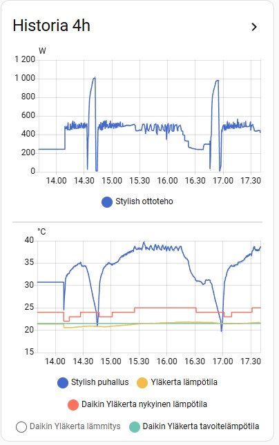 Näin on omassakin. Näin yläkerrassa, missä Stylish hoitaa kokonaan lämmityksen ei puhalluksen kanssa ole ongelmia. Äsken puhalsi autom puhalluksella täysiä, piti laittaa man 4/5 päälle, kun puhalsi liikaa. Kennon lämpötila putosi 28:en niin laukaisi sulatuksen. Sen jälkeen kipusi aika pian taas 4/5 puhallukselle. Jäi eilisestä kokeilusta tuo autom puhallus päälle, yleensä ollut tuo 4/5 man. QO, Streamer ja takkatila päällä, DC/HA pyynti 30.Sen verran on nyt logitettu, että ainakin oma Stylish menee tuohon vedonpoistotilaan kun liquid temp on 28C tai alle.