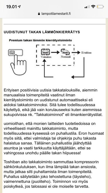 @toshippa lämpötilanpyynnin nosto nostaa automaatilla puhallinnopeutta. Käytännössä kenno lämpenee ja vedonpoisto ei rajoita niin paljon nopeutta. Parempi kuitenkin mielestäni manuaalinopeus kovilla pakkasilla. Meillä ei takkatilalla mitään käyttöä, kun laite ei himmaile lainkaan puhallusnopeutta vielä manuaalisella 2 ja 3 nopeuksilla. Noilla nopeuksilla meillå avoimessa tilassa lämpö leviää jo hyvin kovinmillakin pakkasilla. Nyt äärinurkassa lämpötila 21 C metrin korkeudella ja pakkasta -17C ja puhallus 2/5 22C pyynnillä.
