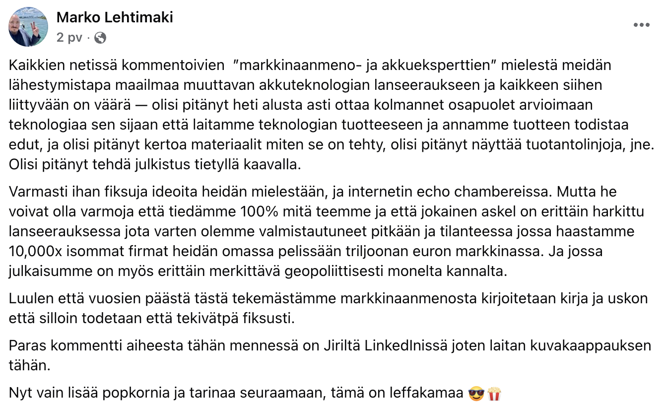 Ei tokikaan... he sanoivat haluavansa hyvän etumatkan vain. Mutta toisaalta voi olla ettei Holyvolt pysty myöskään tekemään akkua yksin, jos siihen liittyy tosiaan materiaali-innovaatiota suomalaisesta tutkimuksesta.