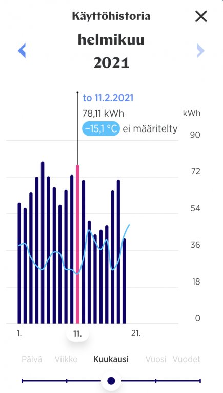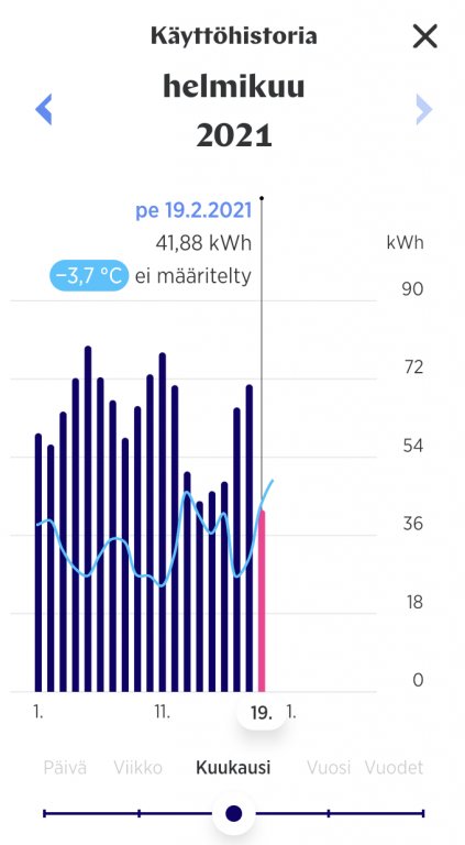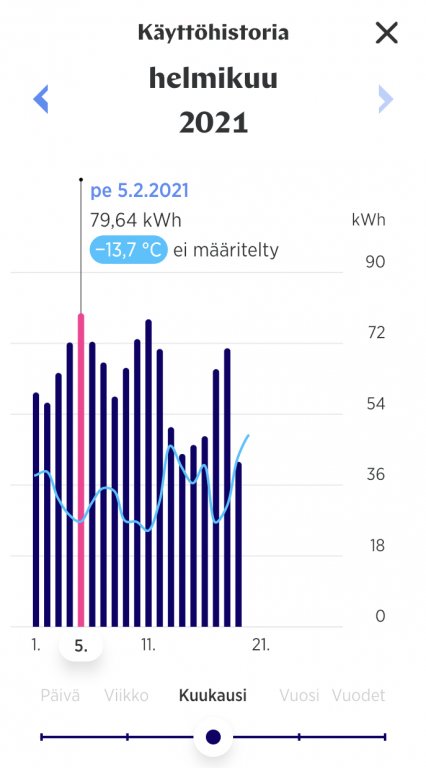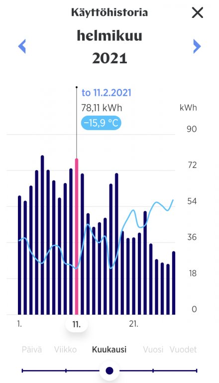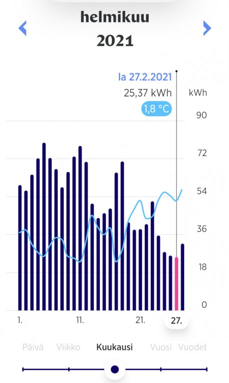 Kovimmat pakkaspäivät 5.2. jolloin -14,42 / 64,84 kWh ja 11.2. jolloin -15,37 / 77,19 kWh. Lämpötila sisällä koko ajan +20-21, työhuoneessa etätyön takia lattialämmitys vähän isommalla, jottei näpit olisi ihan niin jäässä.