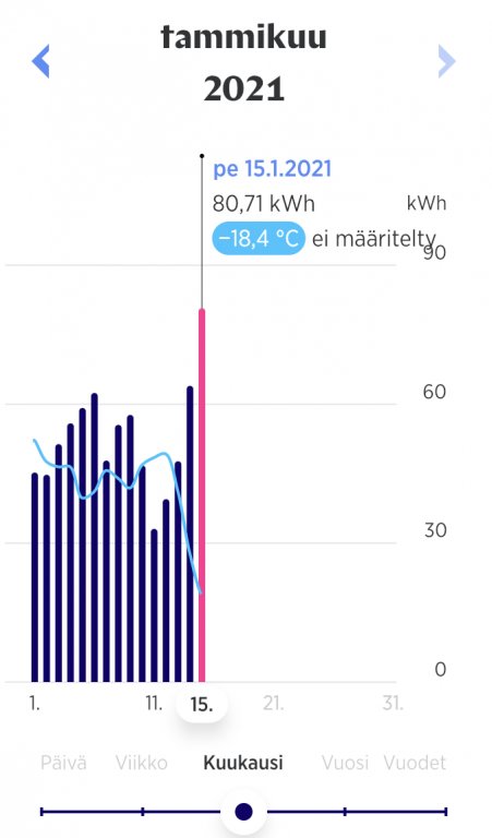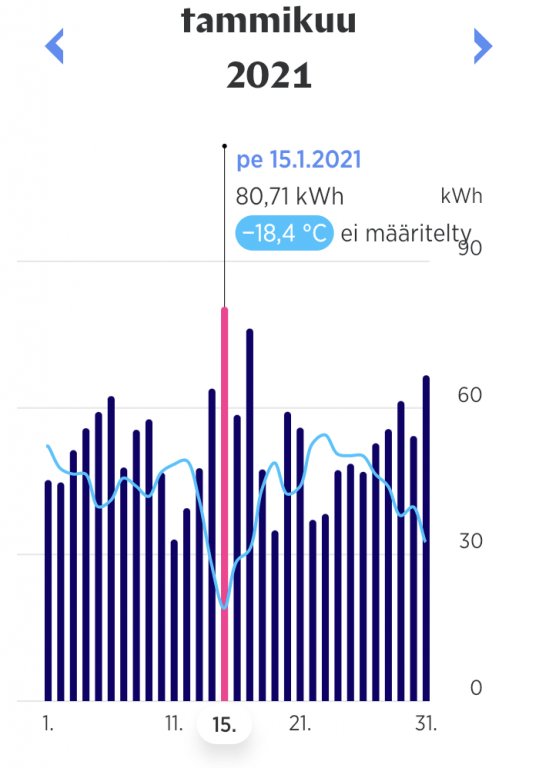 Vähän jälkijunassa osallistun keskusteluun, mutta meillä meni 15.1. (Carunan mukaan päivän keskilämpötila oli -18,49) 64,74 kWh, sisällä lämpötila +20-21. 14.1. (-12,35) näkyy menneen 74,26 kWh, mutta se on ollut saunapäivä, mikä selittää isompaa kulutusta. Takkaa polteltiin kovimpien pakkasten aikaan useampana päivänä.