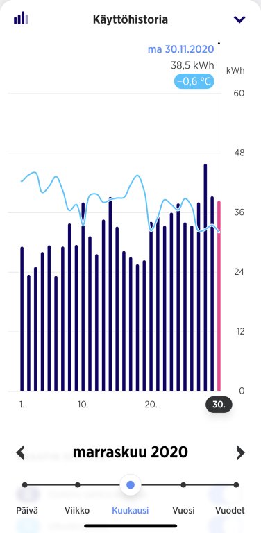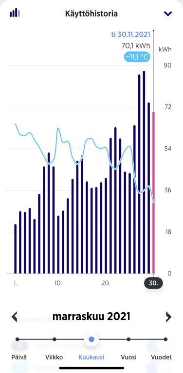 Ja marraskuu mennyt. Ihan kokeilumielessä koko kuukausi vieläkin ilman takkaa. Sauna ~ 10 kertaa. "Mukavuuslämpö" puuttui, kun ei viitsinyt lattialämmöllä kuitenkaan sit niitä viimeisiä mukavuuksia kuluttaa. Joulukuussa siis takka päälle. Viime vuonna poltin näköjään marraskuussa 6 kertaa takkaa :) Varasto (30 kwh), auton lämppäri ja ulkovalot vievät tuosta kokonaiskulutuksesta osansa.