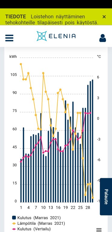 Sähköä meni 11/2020 970 kwh ja nyt 1380 kwh. Vertailuun vaikka 1/2020 jolloin sähköä 1290 kwh…Eri vuodet, eri kuukaudet, eri lämpötilat, eri sähkönkulutukset. Tuosta tämän vuoden käppyrästä näkee kuin viimeinen la-su nostin kokeeksi käyrän 1 -1 —> 1 +2. Ma-ti tiputin käyrän 1 +-0 ja tänään takaisin 1-1.