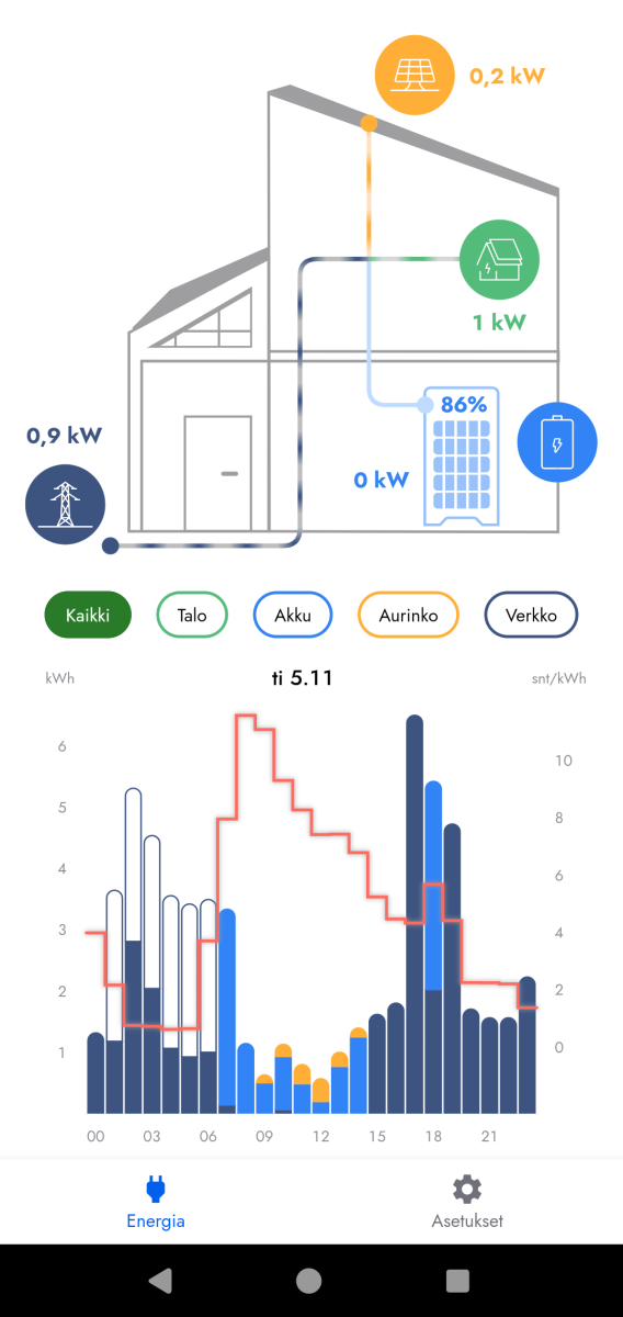 Eräällä tuttavalla on paritalossa akku. Siellä on kiinteähintainen sähkösoppari ja akkua ei käytetä muuhun kuin aurinkosähkön varastoimiseen. Mun mielestä akku menee tuolla tavalla osittain hukkaan.