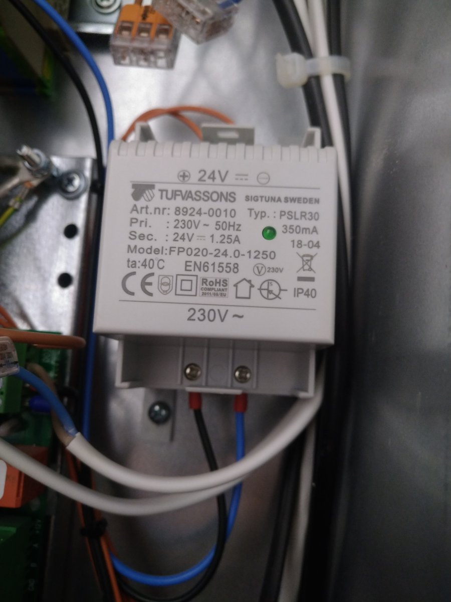 Jos tuollainen löytyy, niin mittaa koneen käydessä että ohjainkortille tulee 24V ja ettei kortilla pala punainen vikavalo. Jos vika sattuu olemaan päällä, niin vielä parempi.