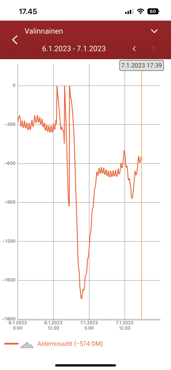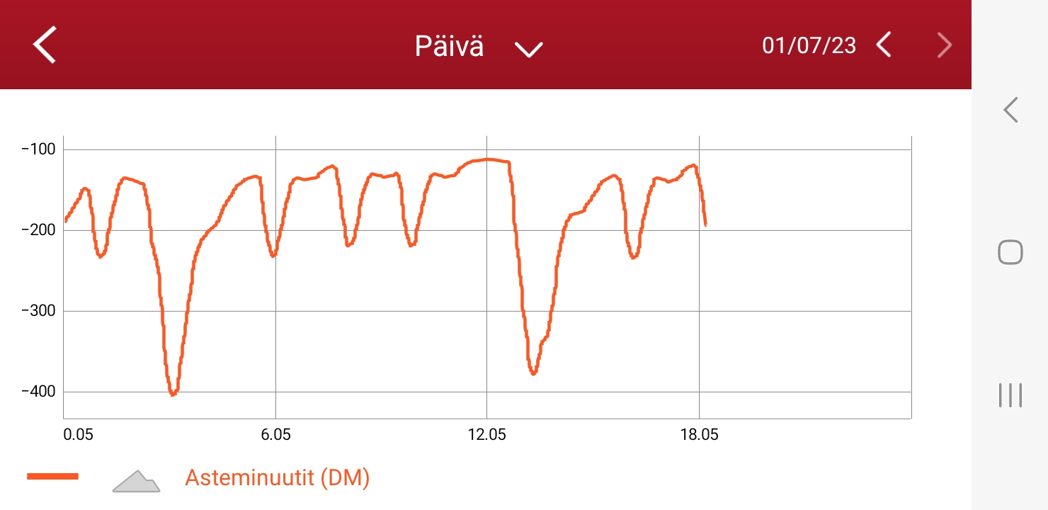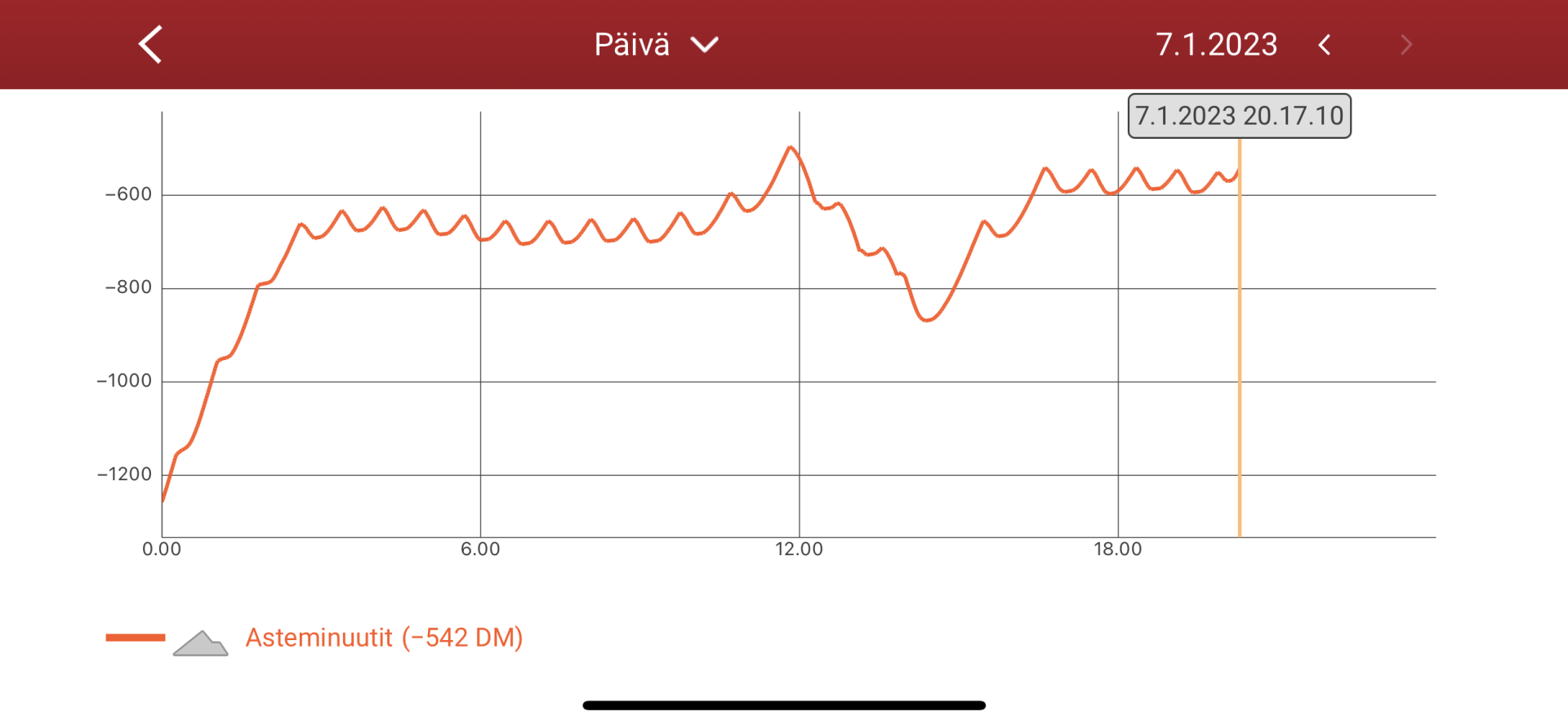 Asteminuutit ei pääse ikinä 0 pintaan mutta tasaisesti menee -600 - -700 asteen välillä joten tuntuu että ehkä joku asetus pielessä? Kaiken näköistä yritetty