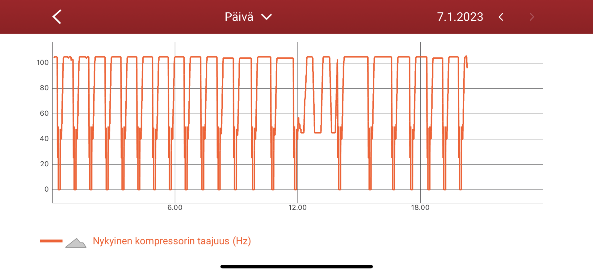 Tuossa kuva pumpun Hz lukemista viimeisen 2pv ajalta. Tänään onnistunut käymään muutaman melkein 1h pätkän putkeen mutta muuten kovin lyhyitä pätkiä.. Ja tosiaan niinkuin tuossa joku jo sanoi niin sisäyksikössä oma 26l puskurivaraaja, mutta erillistä ei laitettu..