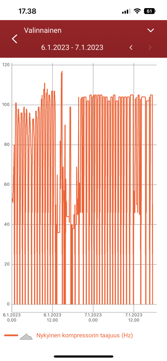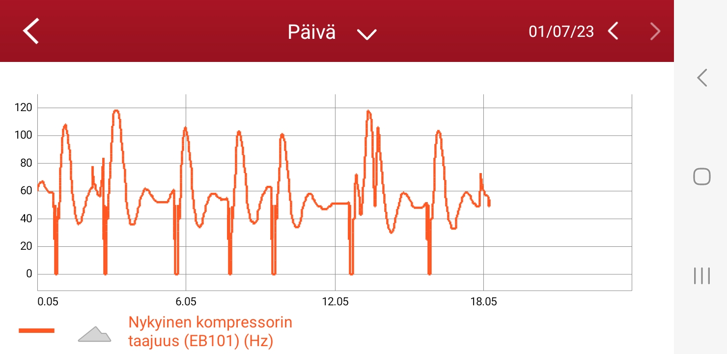 Invertteripumppu tuntuu hassulta, kun ei osaa oikeastaan pitää esim 67hz taajuutta pitkää aikaa vaan nousee heti 45hz 112hz:iin kun asteminuutit laskenut tarpeeksi.