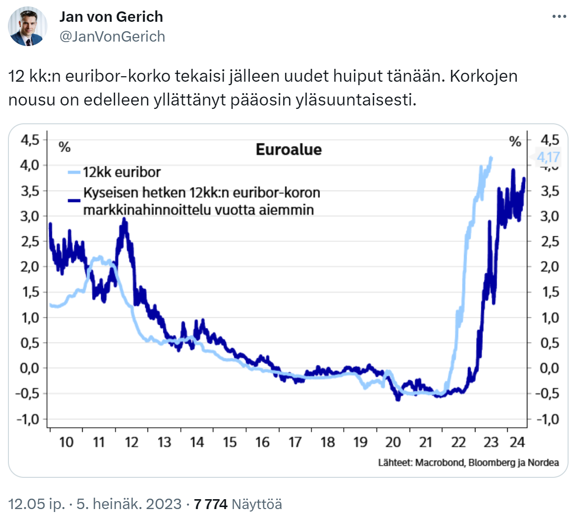 Sinällään kyse on pohjimmiltaan vain siitä, että koronavuosien vuoksi pitkäksi venähtänyt velkaelvytys ja rahansyytäminen on lopetettu. Jos joku on kuvitellut, että nollakorot on jokin pysyvä olotila, pitäisi olla sitä vastuunkantokykyä omista virheistä.