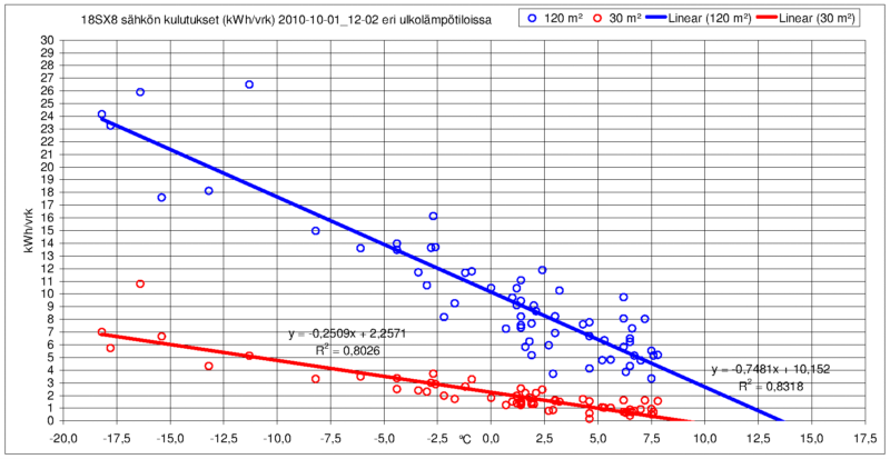 Tähän aiheeseen voisi Hitachi SX Premium ilmalämpöpumppujen omistajat laittaa tietoja oman laitteen sähkön vuorokausikulutuksista (kWh) erilaisissa ulkoilman keskilämpötiloissa (24h keskiarvo). Lämpötilan vuorokausikeskiarvon saa varmimmin omalta sääasemalta tai joltain lähellä olevalta sääasemalta (www.wunderground.com). Jos on oma automaattinen loggeri, onnistuu vuorokauden keskilämpötilan mittaus niinkin (hetkellisiä mittauksia ei voi käyttää tähän). Mittailen itse kulutuksen aamuisin samaan aikaan ja keskilämpötilan kirjaan koko edellisen vuorokauden keskiarvon. Siinä tulee pieni heitto jos lämpötila muuttuu rajusti aamuuyön aikana, vaikutus on kuitenkin pieni kun vertaa esim 7 tunnin vaikutusta 24 tuntiin. Foorumilla on tästä aiheesta hajanaisia tietoja, mutta yhtenäinen esitystapa helpotaisi jokaisen vertaamaan omia tuloksia muihin. Koko vuoden tuloksia mielestäni ei kannata laittaa vaan kaksi tai kolme kuukautta lämmityskauden aikana. Liitteenä omat mittaukseni loka- ja marraskuulta 2010.