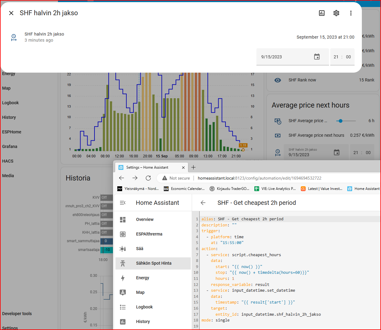 Ja kiitokset päivityksestä, kivasti on pelannut kun olen parisen päivää olen katsellut. Tänään tuli tarvista halvimman jakson etsinnälle ja ihmetttää cheapest period scriptin käytös. Vaikuttaisi siltä että scripti palauttaa jakson alun 2h liian aikaiseksi. Esimerkissä yritän löytää halvimman tunnin, script löytää huomisen klo 21, kun halvin hinta on huomenna klo 23. Pistin hakujaksoksi tässä nyt 1h kun on selvempää esittää ongelma, sama 2h edistäminen tulee myös muihin jaksojen pituuksiin. Kuvasta näet miten olen ajan kysynyt.