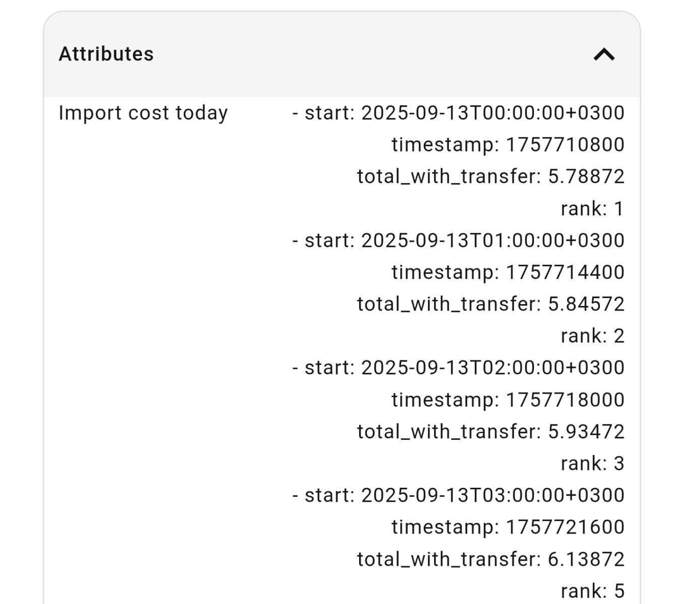 Nykyinen rajapinta on tarkoitus pitää ennallaan yhteensopivuuden vuoksi. Eli hinnat tulee tuntihinnoilla edelleen (keskiarvo laskettu varteista). Näinn tämä yaml toimisi kuten ennenkin.