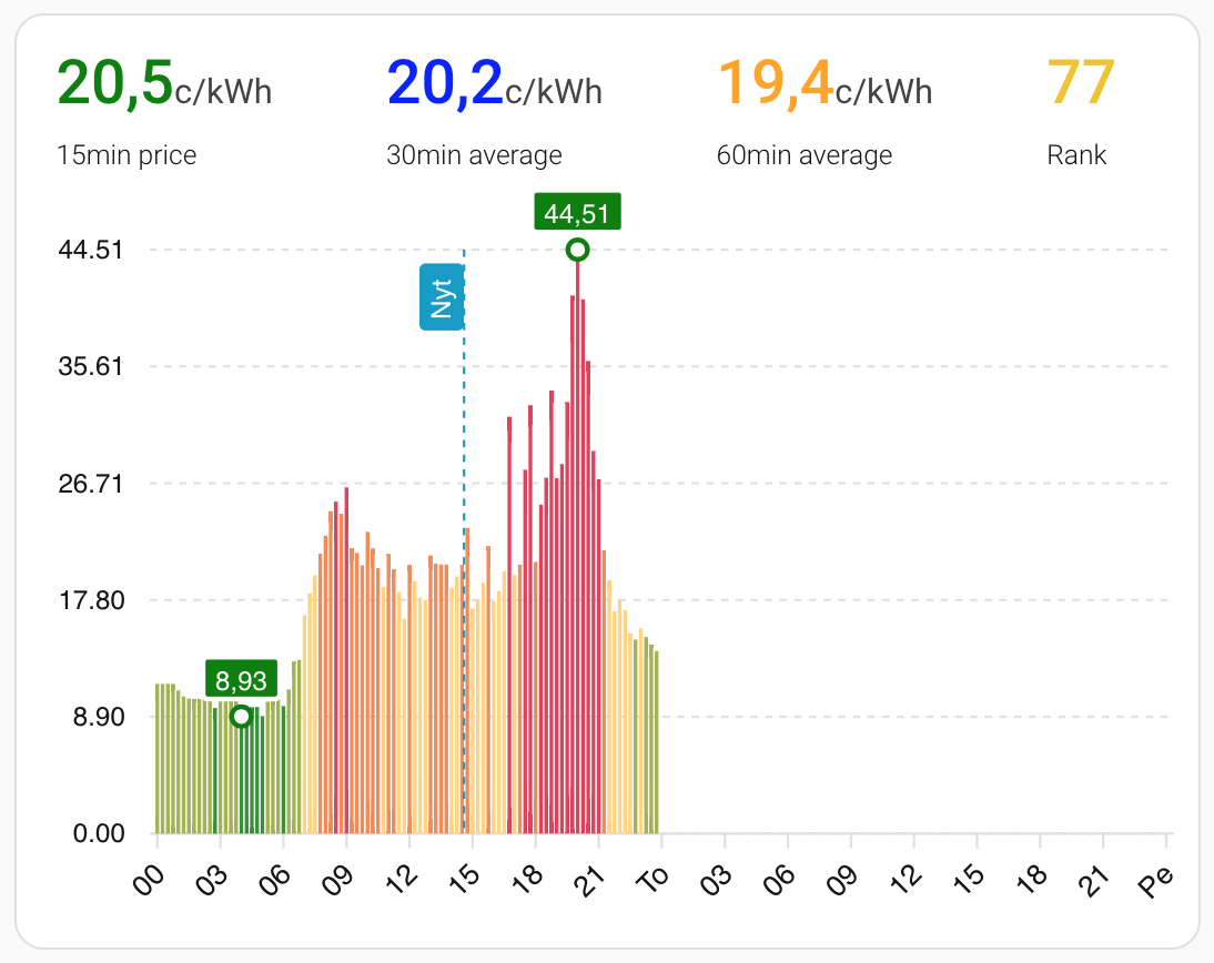 Tänään tuli Electralta ilmoitus, että huomenna siirrytään 15min sähköön.. :( Ja SHF:n kautta tuli keskiarvot. Hyviä ideoita mitä voi tehdä.. minulla on kaikkien laitteiden lämmitykset SHF:n takana, niin tarve olisi kyllä saada tuo varttihinta käytöön asap. :( Nordpoolista sain kyllä näkyviin huomisen hinnat 15 min välein, mutta kun kaikki automaatiot käyttää rank or price yhdistelmää. Esimerkiksi huomenna klo 7:ltä varttien ero noin 8.7 sentin ja 13,3 sentin välillä. kyllä kiinnoistaisi tuokin säästö ottaa talteen mikäli vain mahdollista