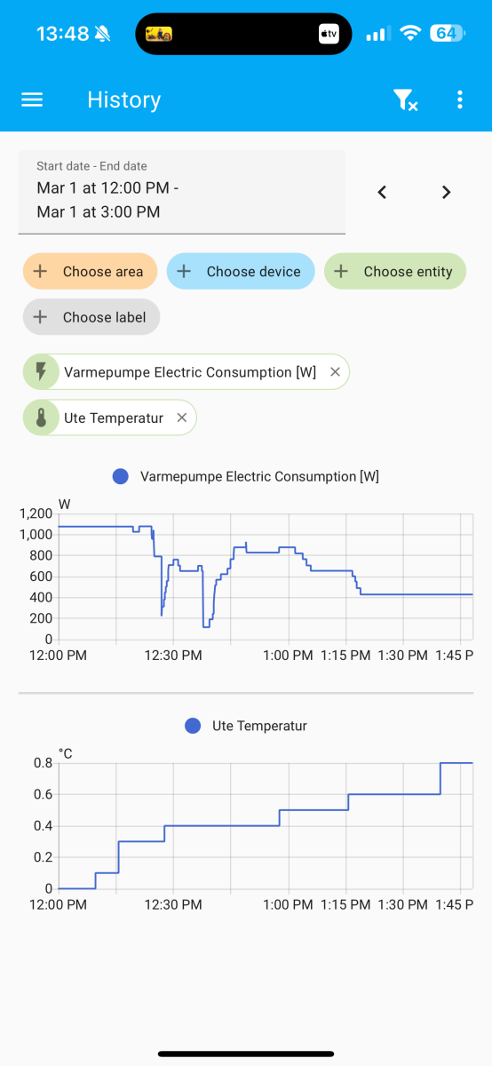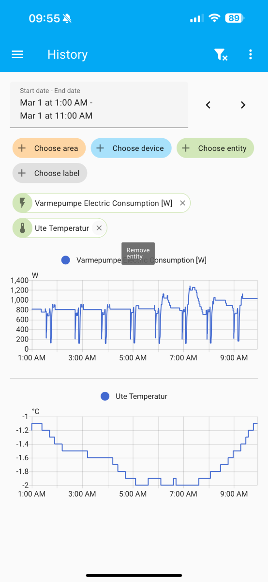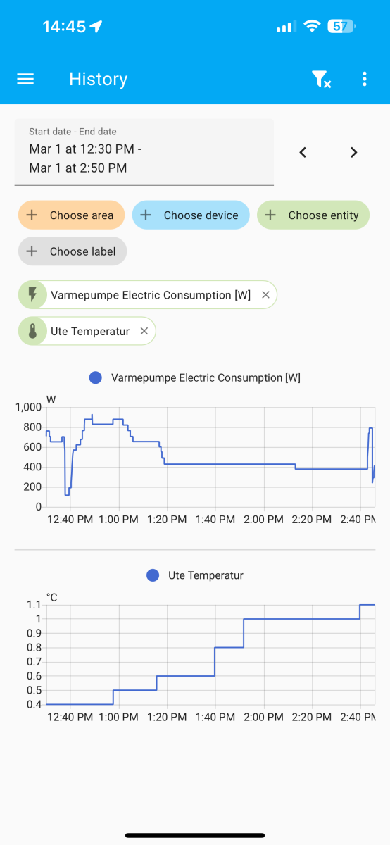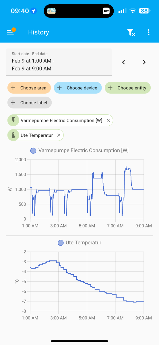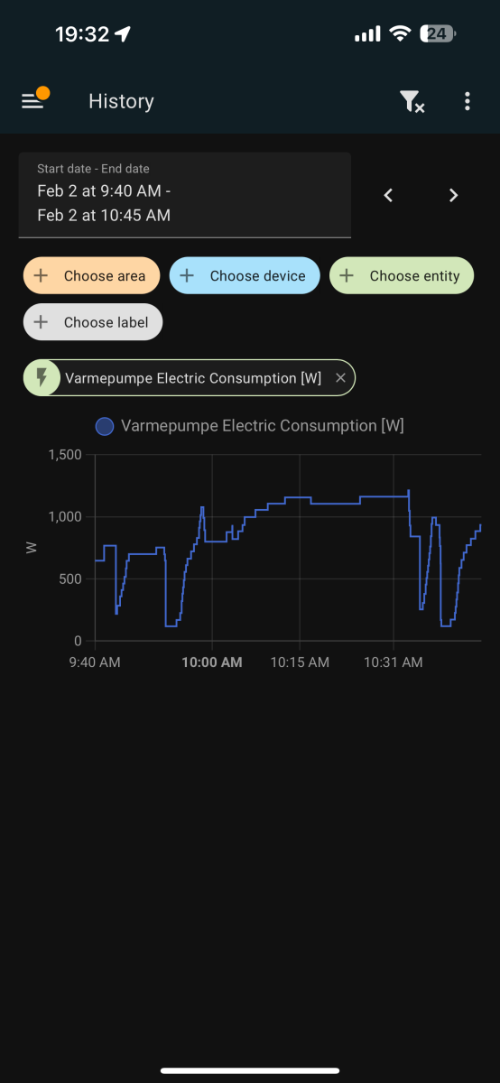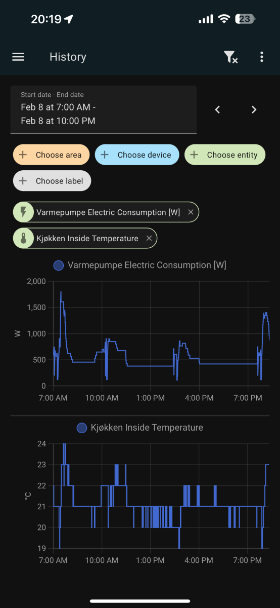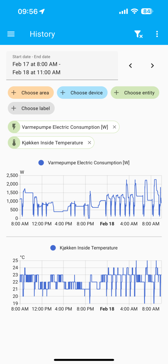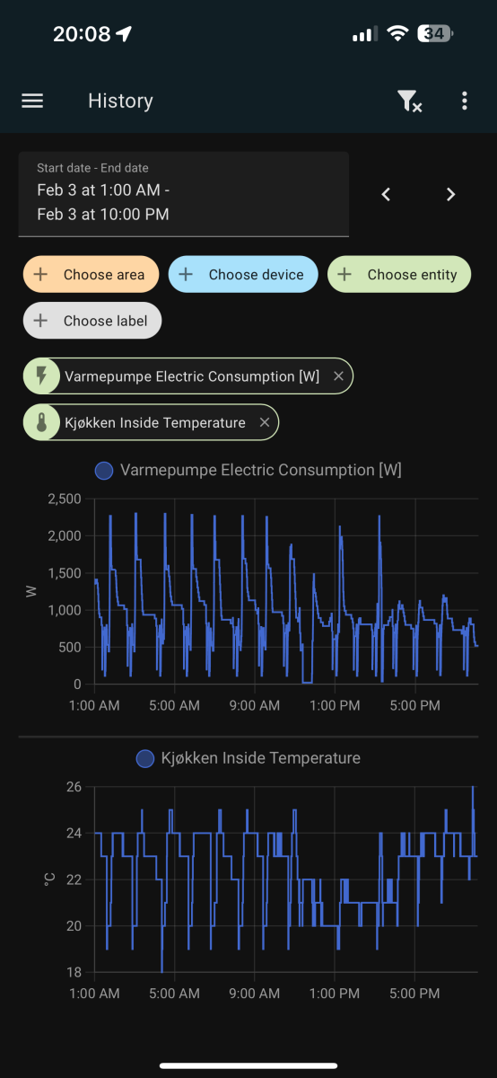 E.g. Tonight it didn't ramp up, just stayed at 1200-1500W even though the internal temp reported by the pump was 3 degrees off causing the house to cool down instead of keeping it warm. Increasing the setpoint to 24 in the morning caused it to suddenly go to 2000W.