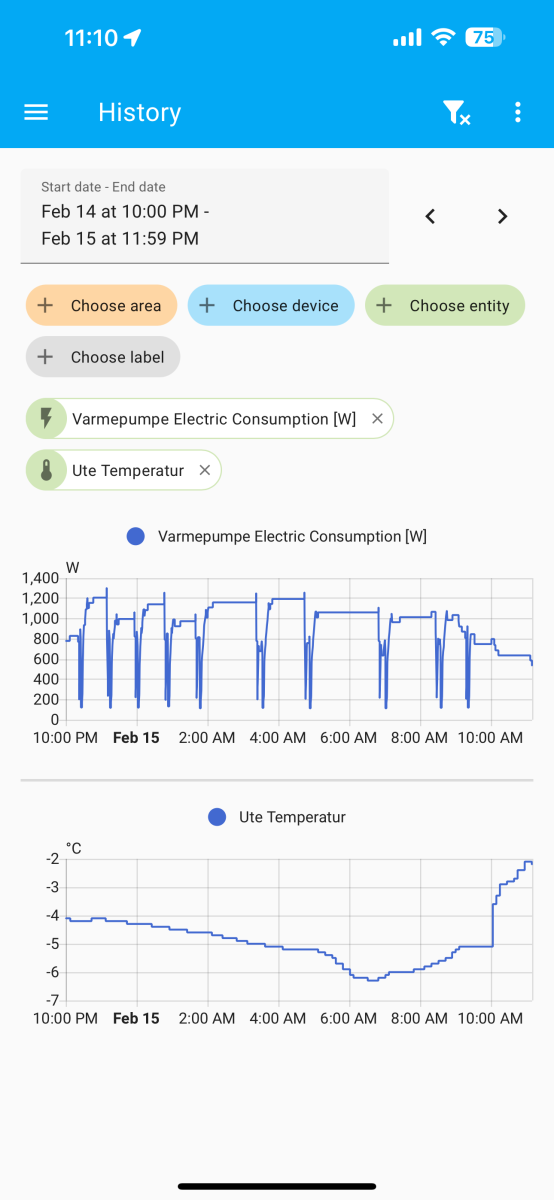 Just to be clear, it’s not a significant drop, but when the temperature is a stable 22.5-23 for 3-4 hours at night, with a trend of the temperature moving upwards before we go to bed and outside it’s going from -7 to -4 during the night, I don’t expect the temperature to drop 1.5 degrees during the night when the setpoint is 23, waking up with 21 degrees today morning with a downwards trend and the pump not seeming to use more energy to give more heat. With the FH35 I had it set at 21 degrees, then it was 22 in the house with +/- 0.5 degrees as expected both night and day, it seemed it regulated itself better according to the indoor temperature. Setpoint had to be changed up or down when there was -5 and -10, other than that, pretty stable throughout the season. With HZ25 there are daily needs for temperature adjustments (up or down 1 degree to try to keep it stable).