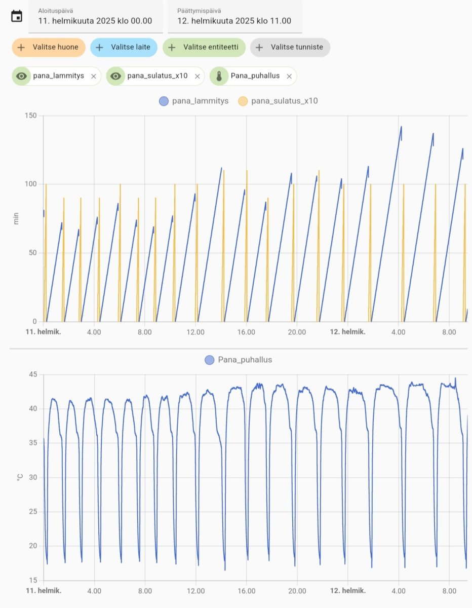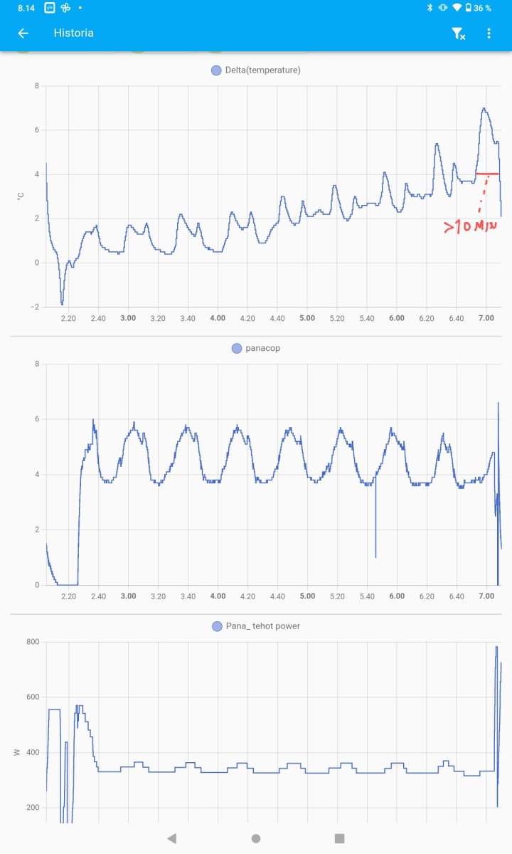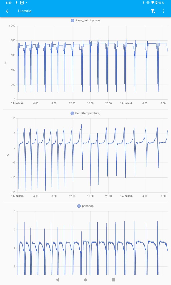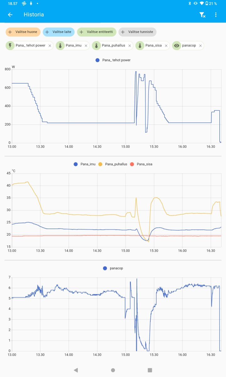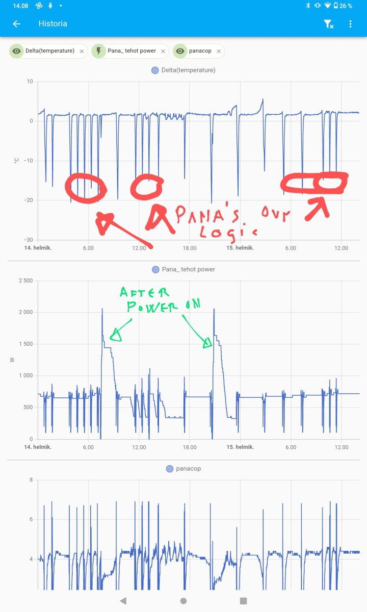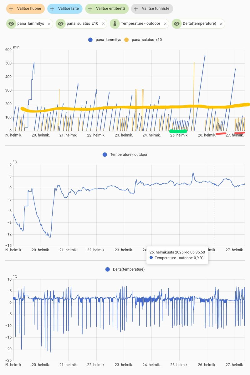 I'm now able to control Pana's defrosting with "Mitsurunner"-solution. Below are some charts comparing the operation with/without Mitsurunner. It shows that Pana's own logic keeps heating-periods too short.