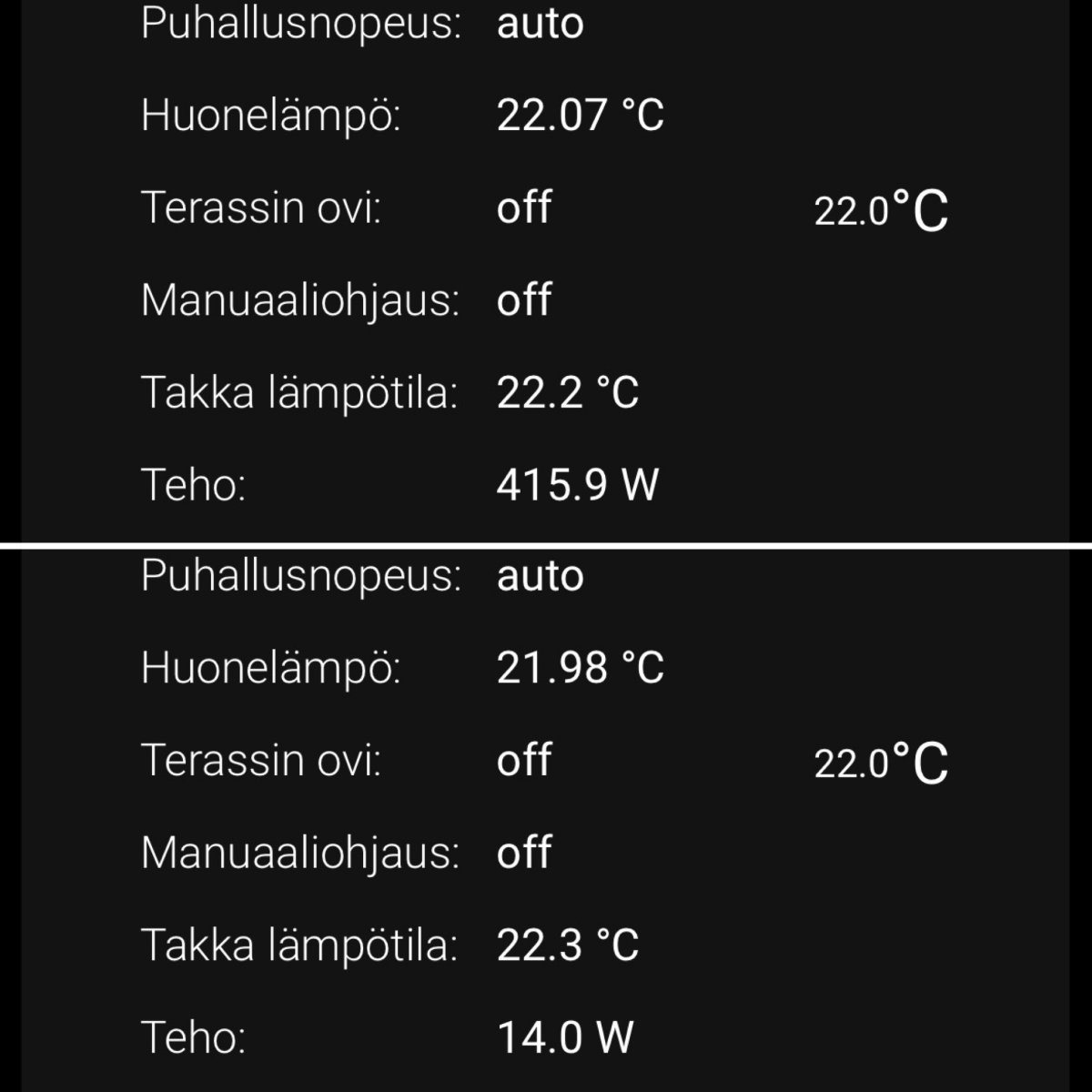 Ylemmässä on laite automaatilla ja lämmitys-tila aktiivinen, kun alemmassa pelkkä puhallus päällä. Erillismittarein mitatun huoneen lämpötilojen keskiarvo ehti just tipahtaa alle 22°C ruutukaapausten välissä.